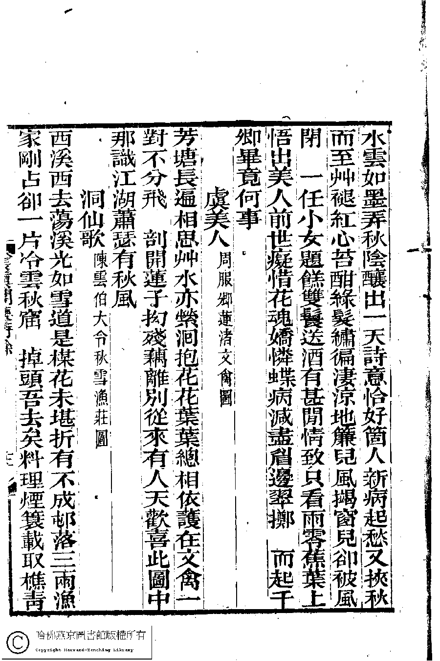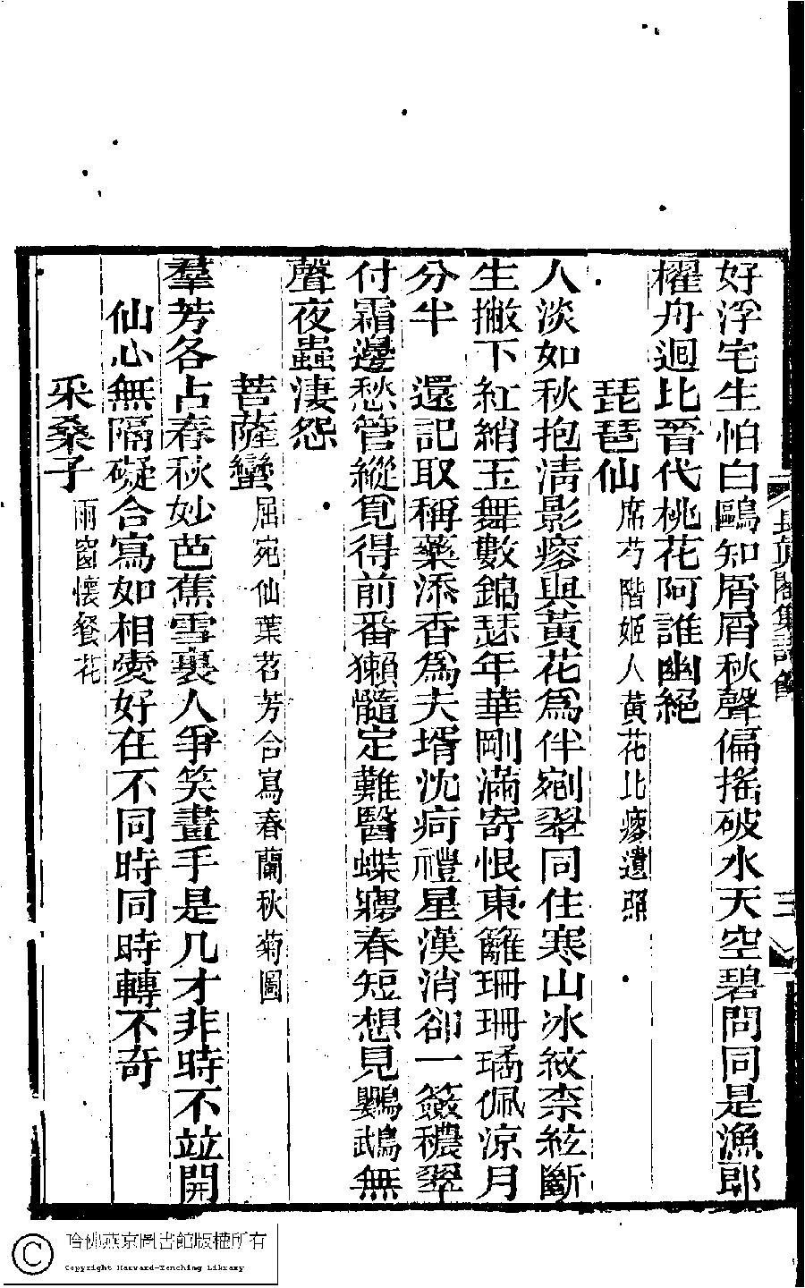 | (PRINT FRIENDLY VERSION) 長真閣集﹕七卷(清席佩蘭撰)。光緖十七年(1891)强氏南皋草廬刻本。 ![]() Page : 詩餘.3b | click for larger image | 長真閣集﹕七卷(清席佩蘭撰)。光緖十七年(1891)强氏南皋草廬刻本。![]() Page : 詩餘.3a | click for larger image | Back |
