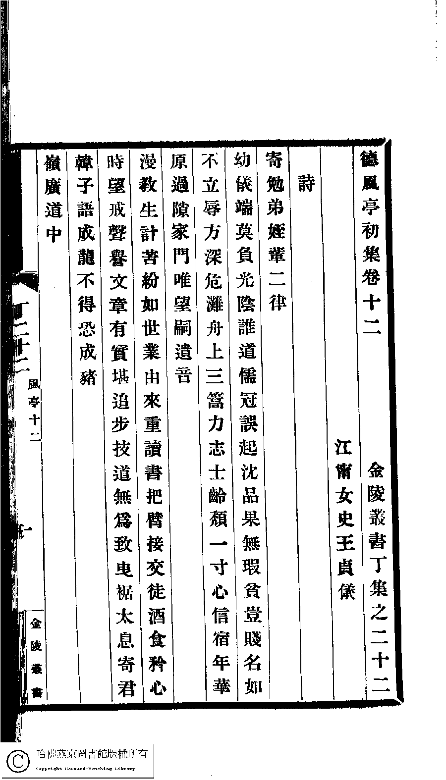 | (PRINT FRIENDLY VERSION) 德風亭初集﹕十三卷(清王貞儀撰)。民國五年(1916)蔣氏[國榜]愼脩書屋校印本。 ![]() Page : 12.1a | click for larger image | Back |