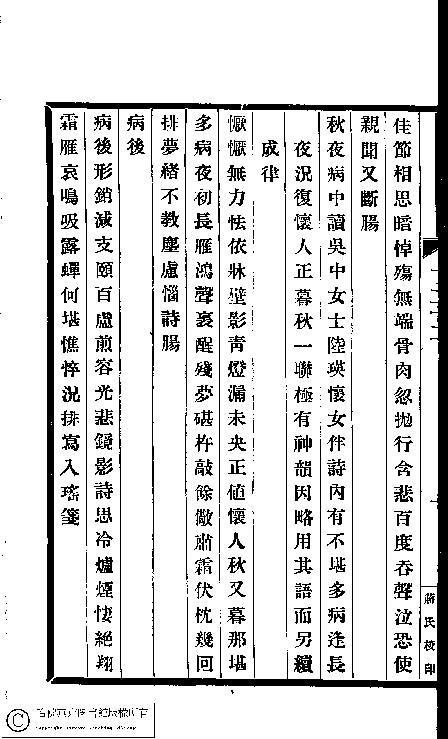 Poem [Qiu ye bing zhong du wu zhong nü shi Lu Ying huai nü ban shi nei you bu kan duo bing feng chang ye kuang fu huai ren zheng mu qiu yi lian ji you shen yun yin lüe yong qi yu er ling xu cheng lü]