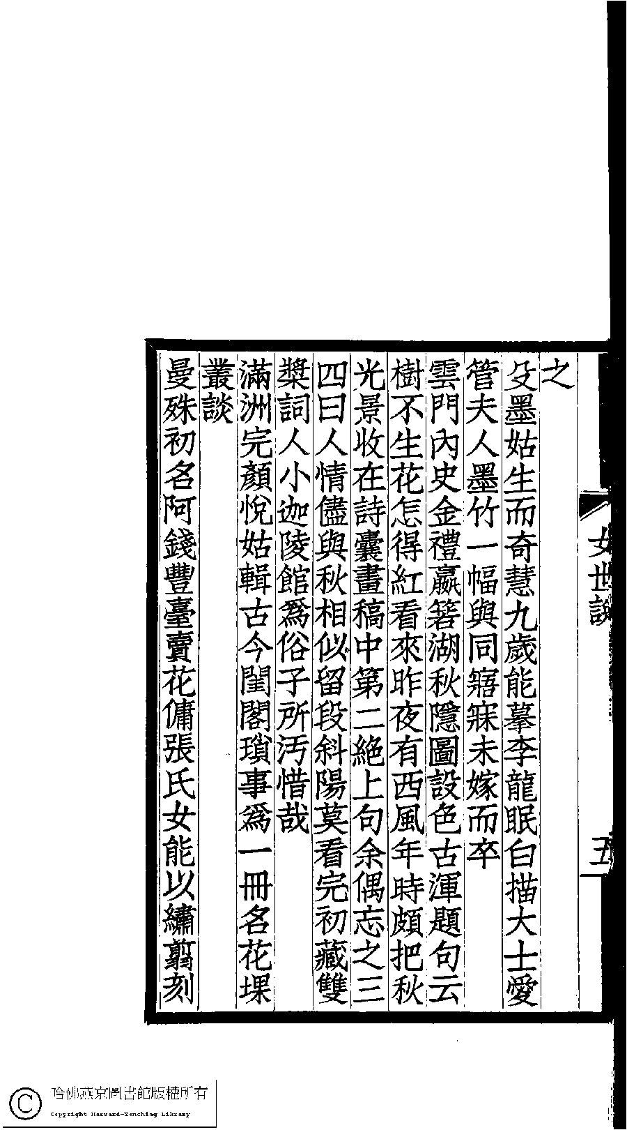 | (PRINT FRIENDLY VERSION) 女世說(清嚴蘅撰)。1921年上海聚珍倣宋印書局印本。 ![]() Page : 5b | click for larger image | Back |