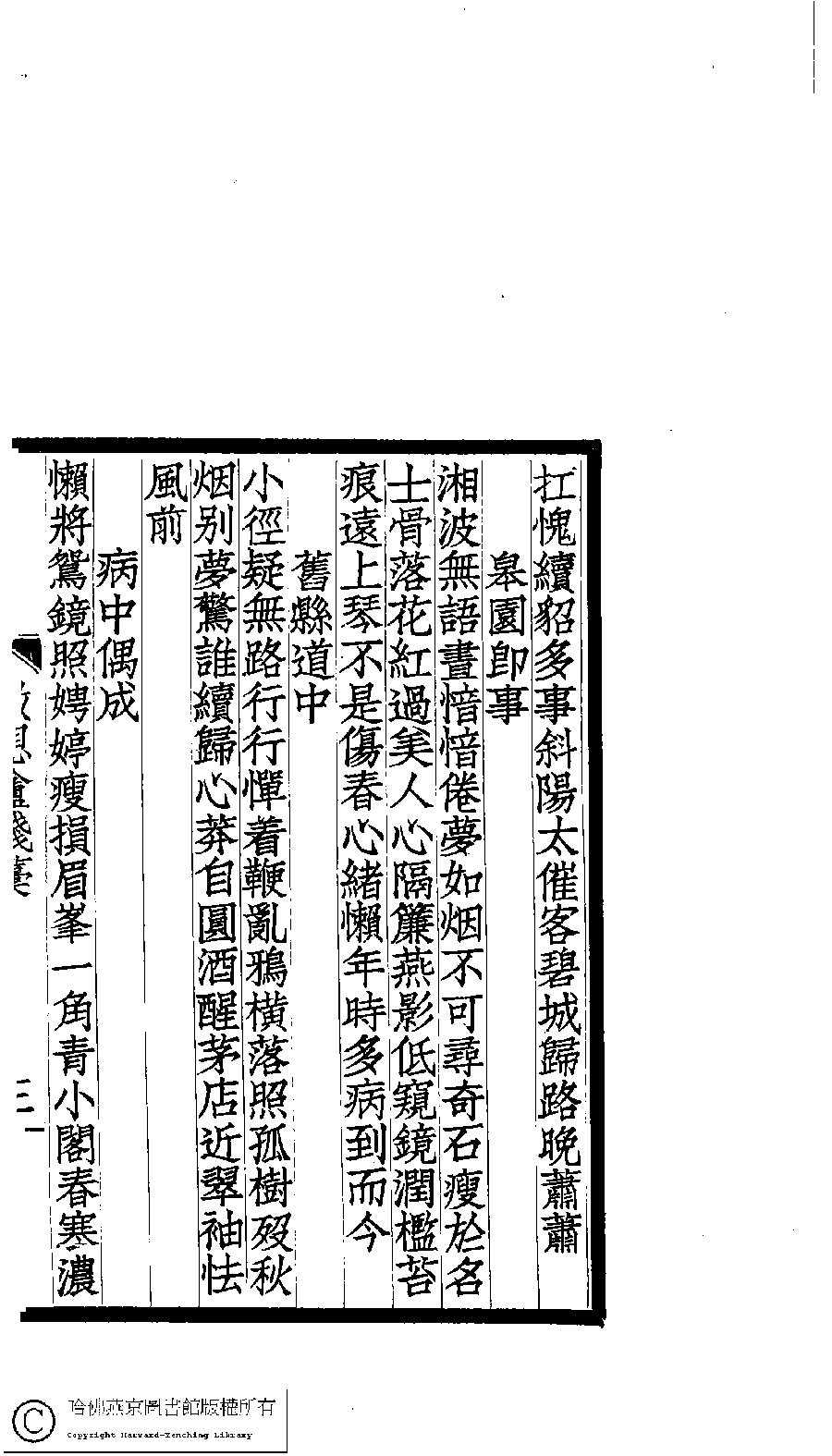 | (PRINT FRIENDLY VERSION) 嫩想盦殘稿(清嚴蘅撰)。民國十一年(1921)上海聚珍倣宋印書局鉛印線裝倣宋本。 ![]() Page : 2a | click for larger image | 嫩想盦殘稿(清嚴蘅撰)。民國十一年(1921)上海聚珍倣宋印書局鉛印線裝倣宋本。![]() Page : 1b | click for larger image | Back |