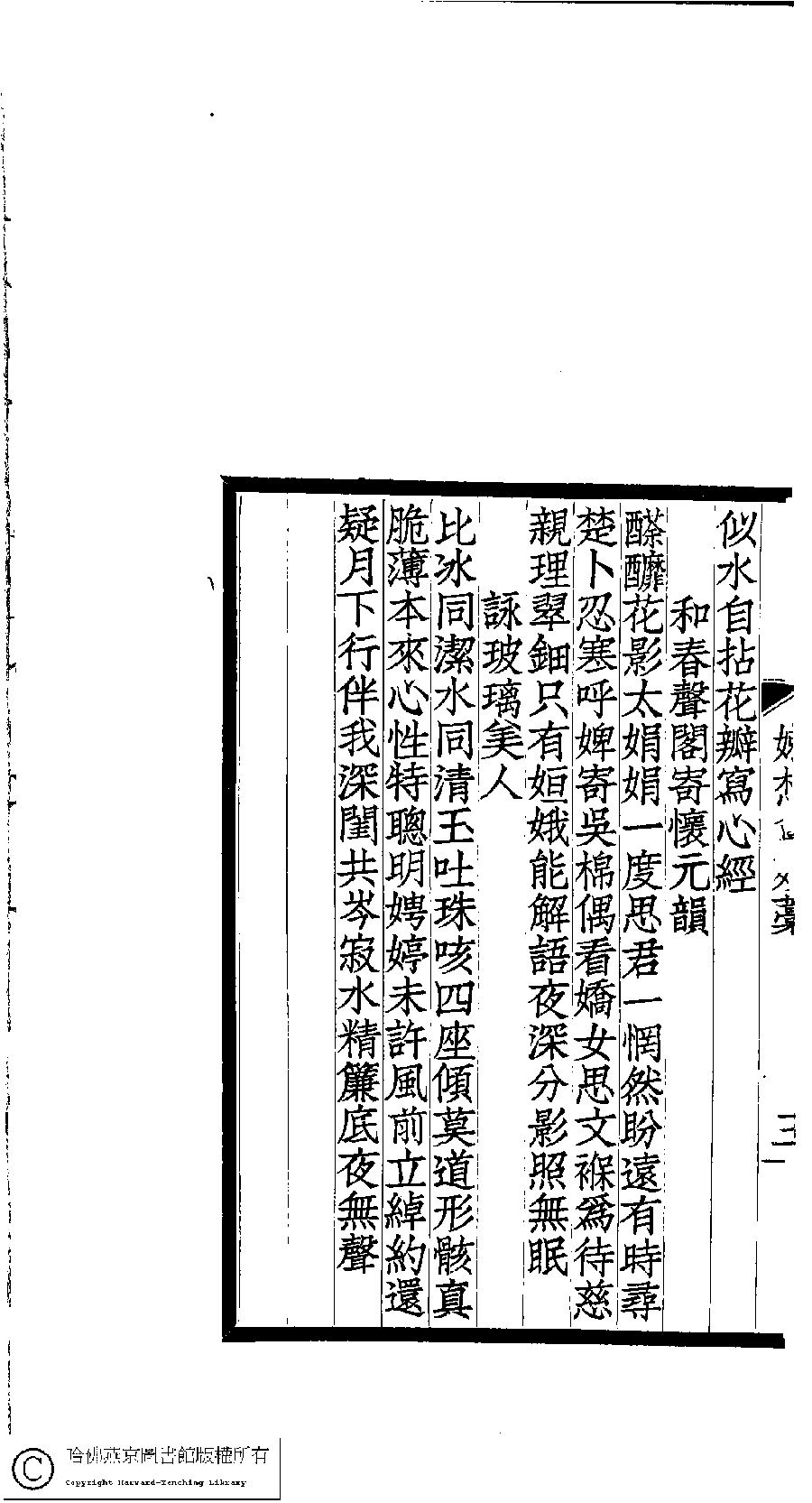 | (PRINT FRIENDLY VERSION) 嫩想盦殘稿(清嚴蘅撰)。民國十一年(1921)上海聚珍倣宋印書局鉛印線裝倣宋本。 ![]() Page : 2b | click for larger image | Back |