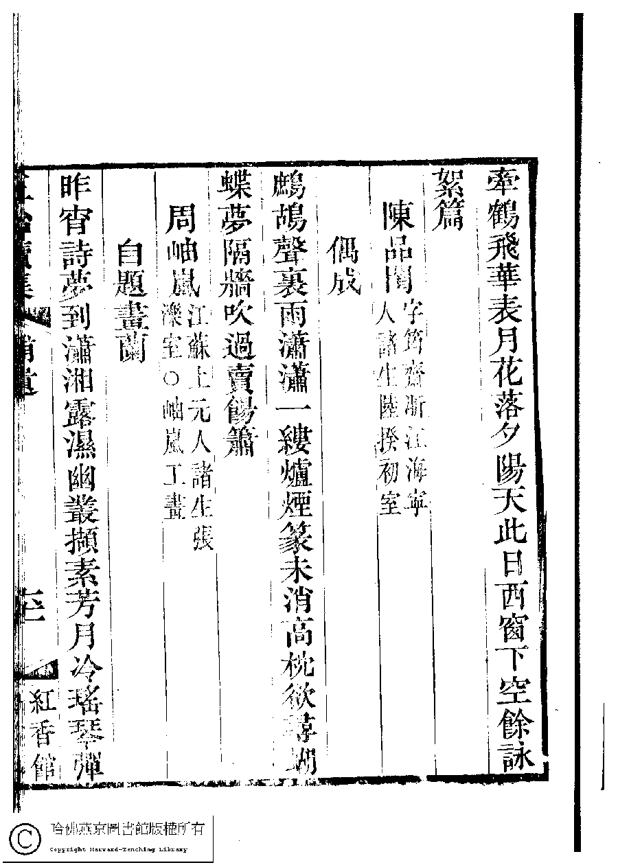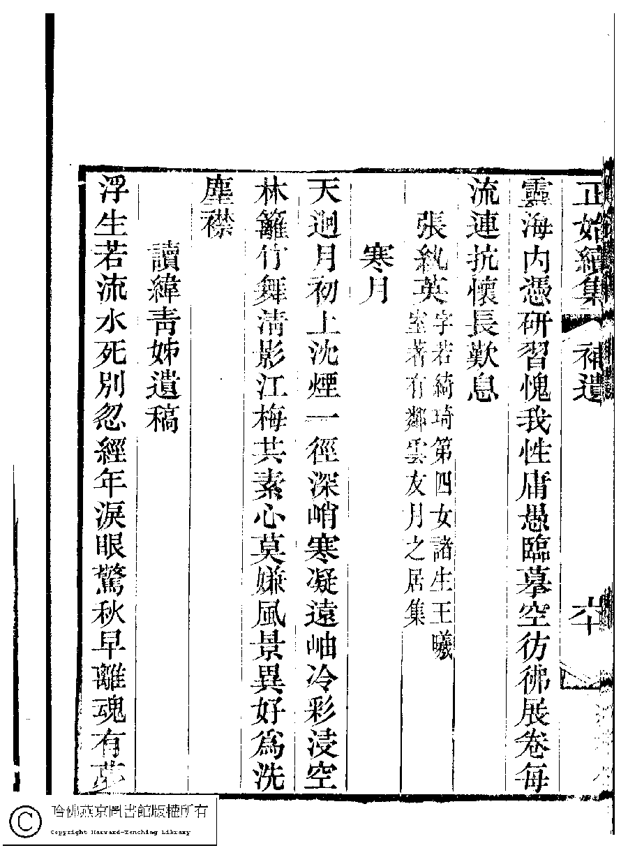 | (PRINT FRIENDLY VERSION) 國朝閨秀正始續集﹕十卷﹐附錄﹕一卷﹐補遺﹕一卷﹐輓詞﹕一卷(清惲珠輯)。清道光十六年(1836)紅香館刻本。 ![]() Page : 補遺.61a | click for larger image | 國朝閨秀正始續集﹕十卷﹐附錄﹕一卷﹐補遺﹕一卷﹐輓詞﹕一卷(清惲珠輯)。清道光十六年(1836)紅香館刻本。![]() Page : 補遺.60b | click for larger image | Back |