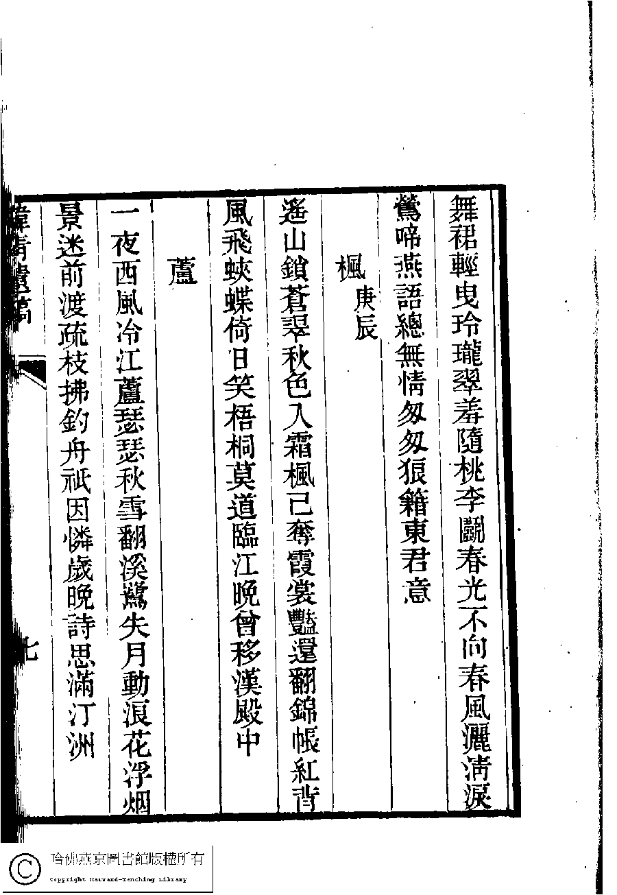 | (PRINT FRIENDLY VERSION) 緯青遺稿﹕一卷(清張𥿑英)。光緖十五年(1889)江隂金氏校刊本。 ![]() Page : 7a | click for larger image | Back |