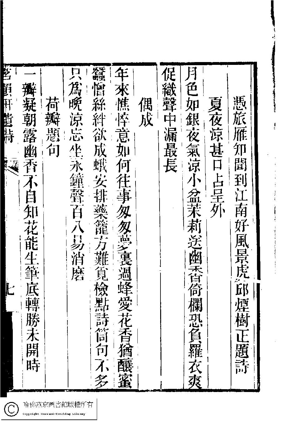 | (PRINT FRIENDLY VERSION) 茗韻軒遺詩﹕一卷(清王甥植撰)。清同治四年(1865)紫琅寓館刻本。 ![]() Page : 7a | click for larger image | Back |