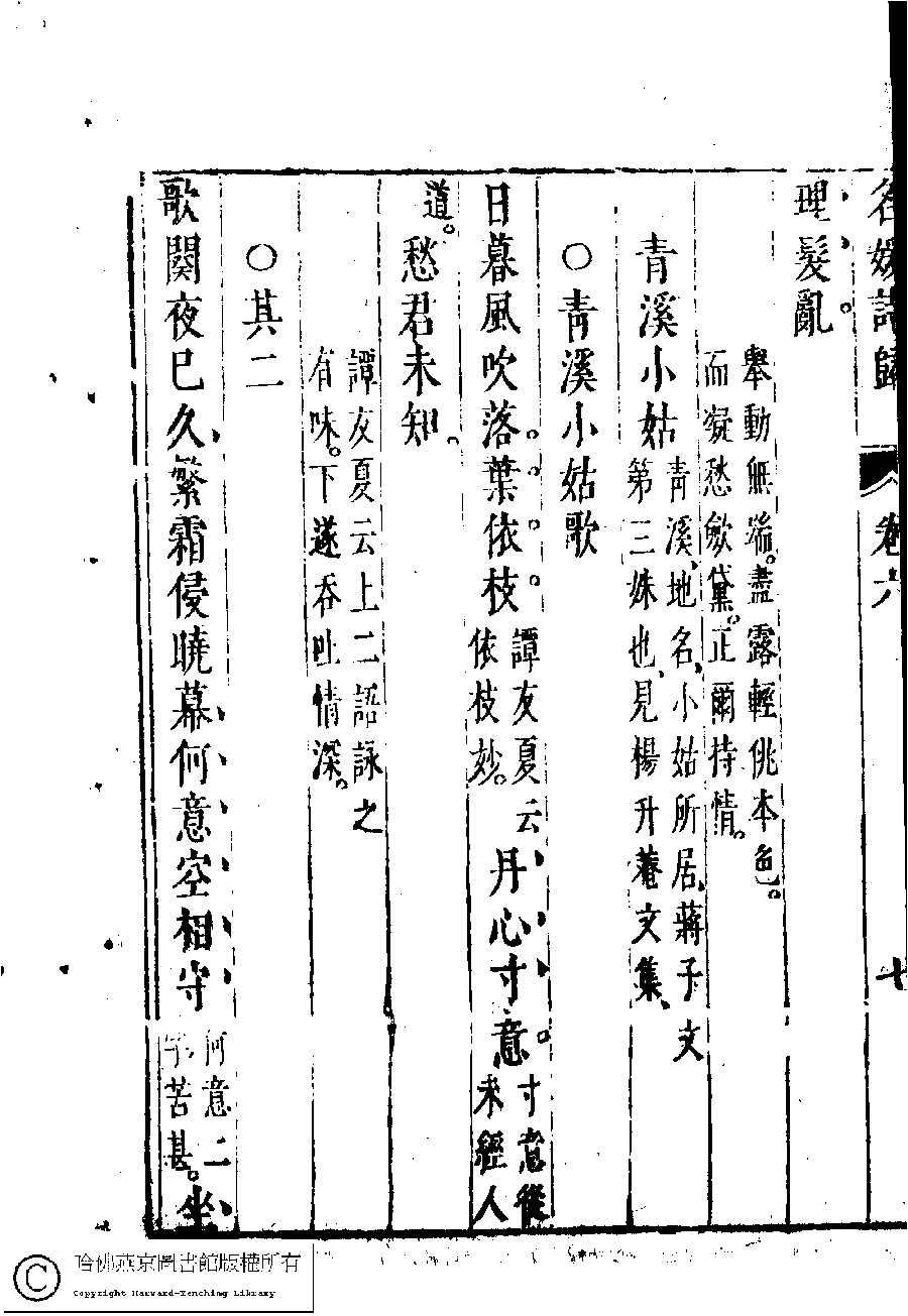 | (PRINT FRIENDLY VERSION) 名媛詩歸﹕三十六卷(鍾惺點次)。明末(1621-1644)刻本 ![]() Page : 6.7b | click for larger image | Back |