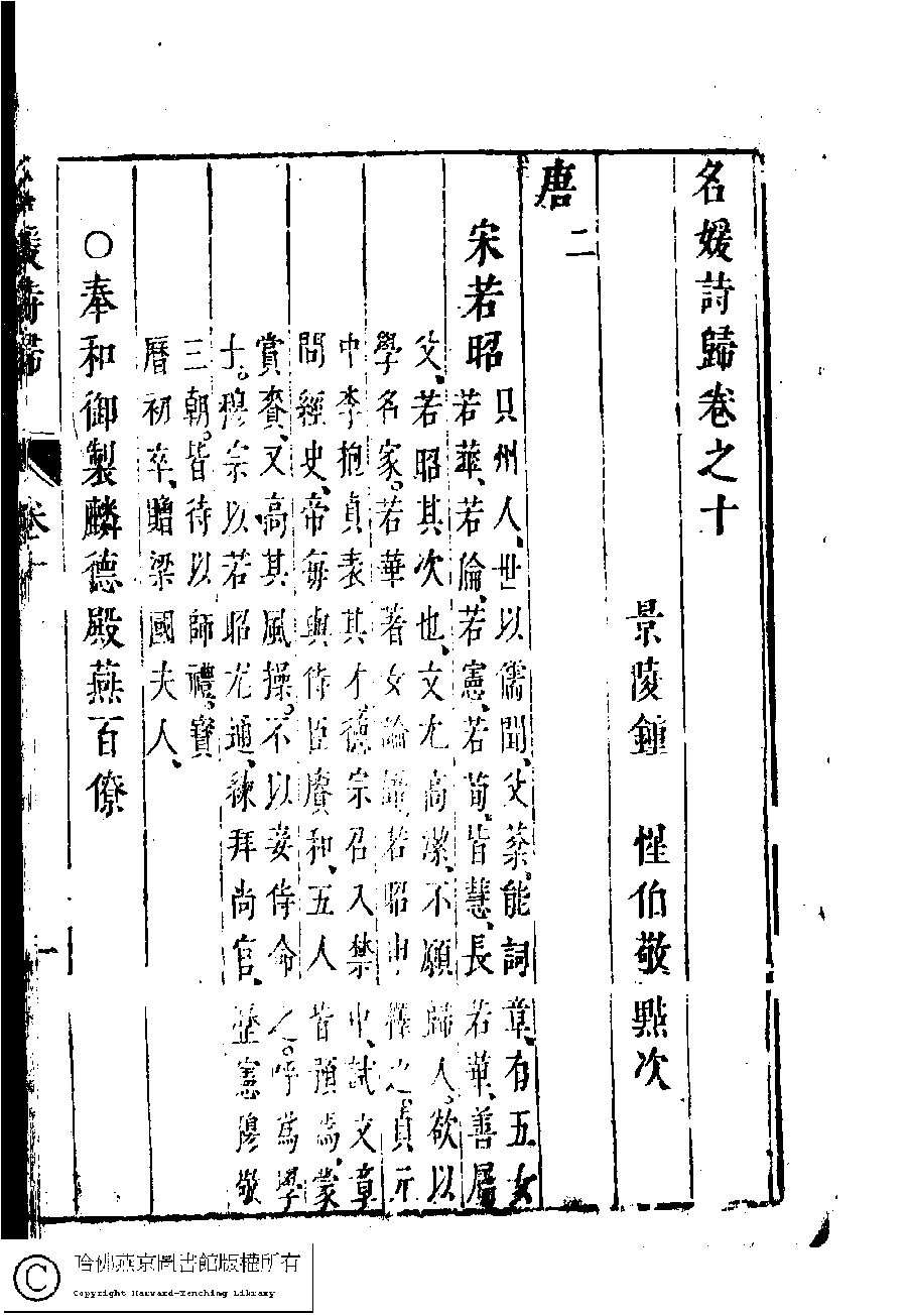 | (PRINT FRIENDLY VERSION) 名媛詩歸﹕三十六卷(鍾惺點次)。明末(1621-1644)刻本 ![]() Page : 10.1a | click for larger image | Back |