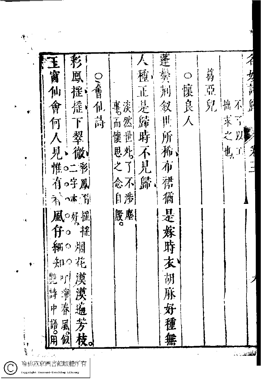| (PRINT FRIENDLY VERSION) 名媛詩歸﹕三十六卷(鍾惺點次)。明末(1621-1644)刻本 ![]() Page : 12.9b | click for larger image | Back |