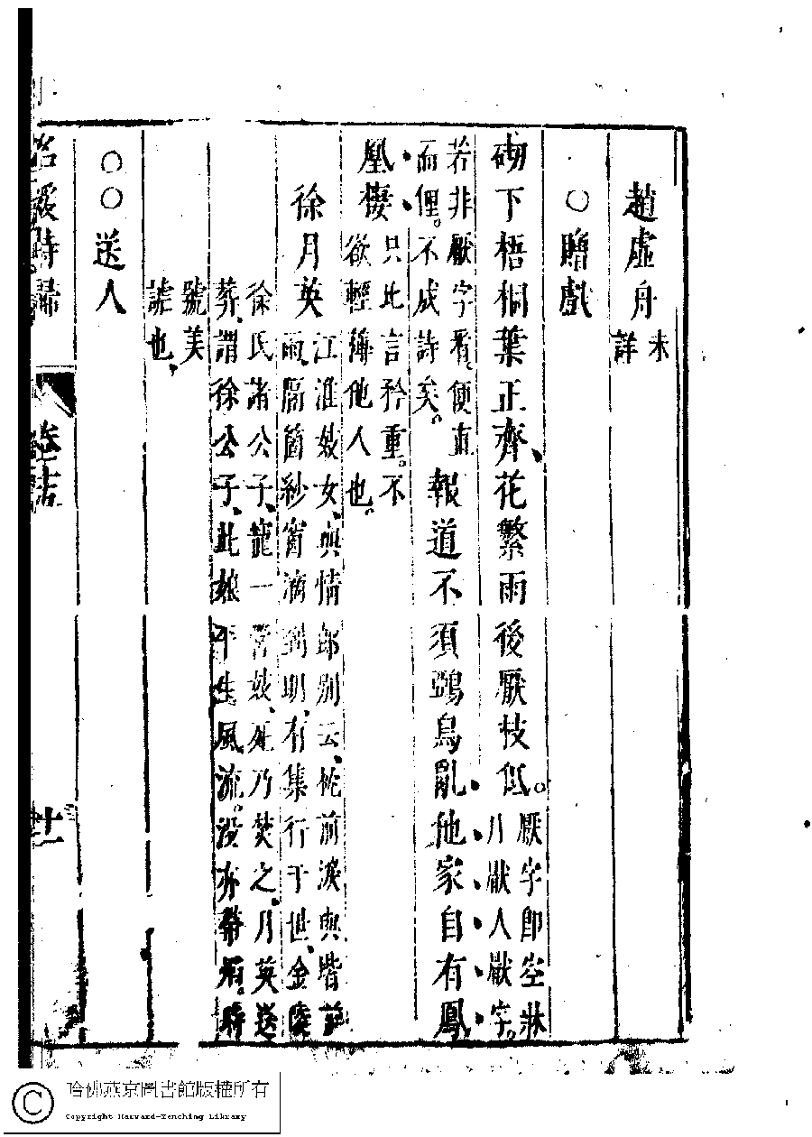 | (PRINT FRIENDLY VERSION) 名媛詩歸﹕三十六卷(鍾惺點次)。明末(1621-1644)刻本 ![]() Page : 15.11a | click for larger image | Back |