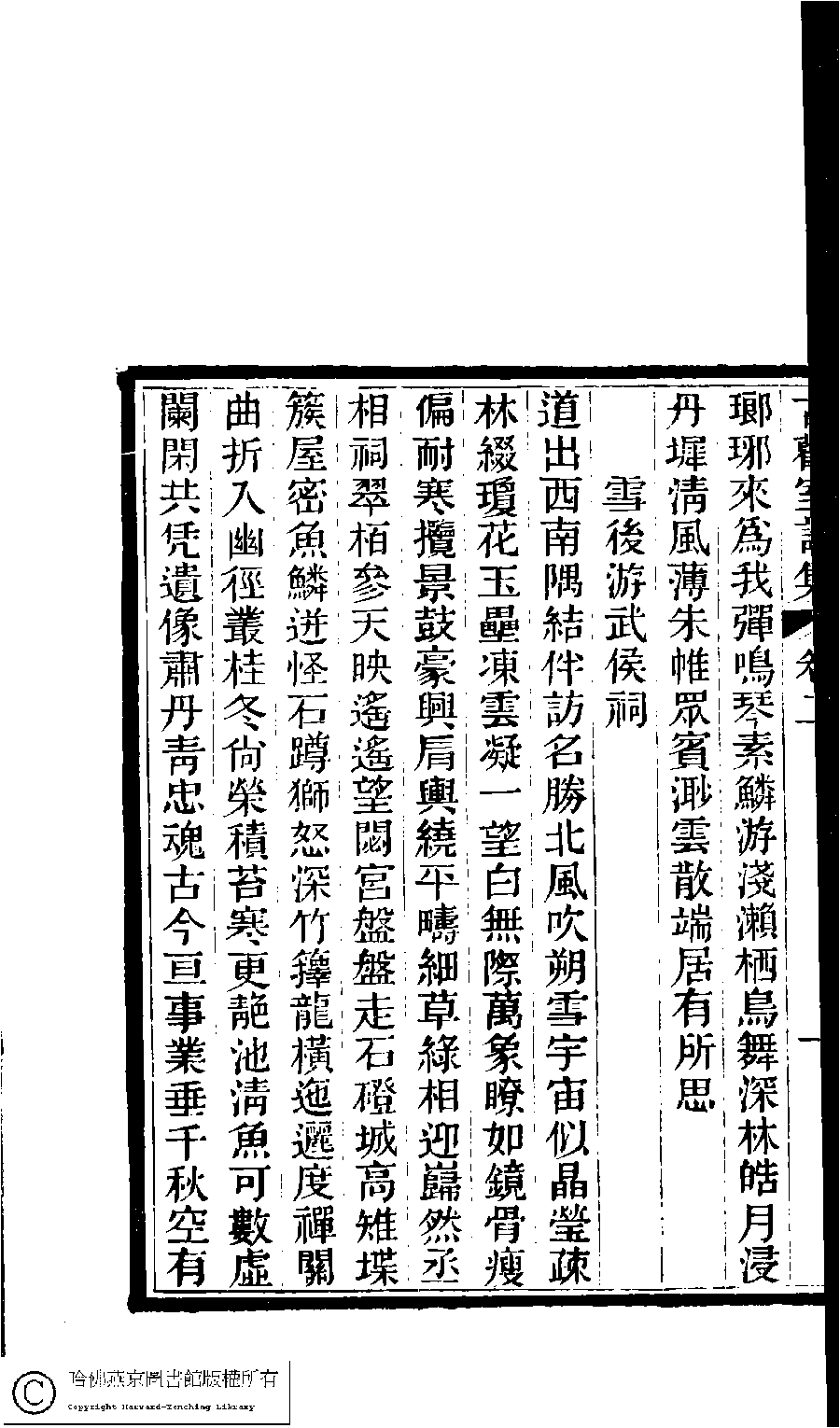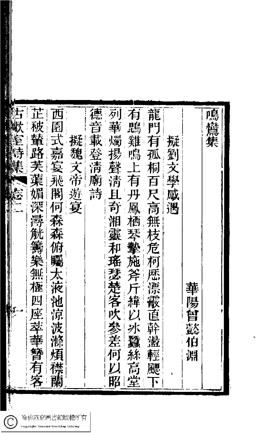 | (PRINT FRIENDLY VERSION) 古歡室詩集:三卷﹐詞集﹕一卷(清曾懿撰)。清光緖三十三年(1907)刻本。 ![]() Page : 2.1b | click for larger image | 古歡室詩集:三卷﹐詞集﹕一卷(清曾懿撰)。清光緖三十三年(1907)刻本。![]() Page : 2.1a | click for larger image | Back |