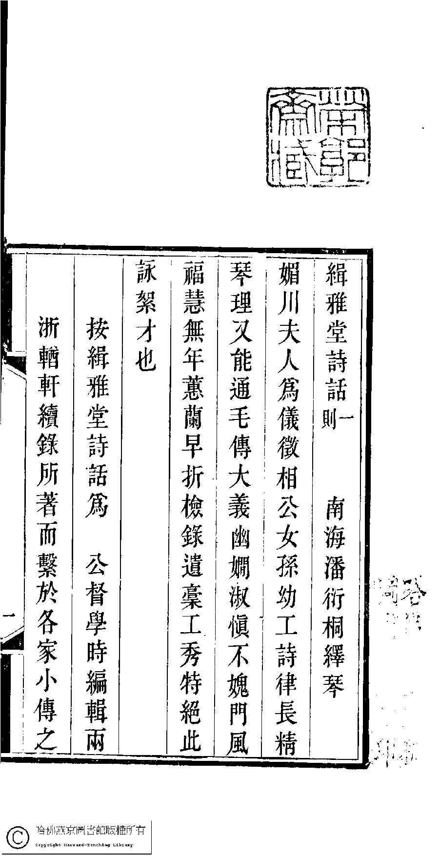 | (PRINT FRIENDLY VERSION) 慈暉館詩詞草(清阮恩灤撰)。清光緖元年(1875)據咸豐四年(1854)武林沈氏刋本補刋 ![]() Page : 詩話.1a | click for larger image | Back |
