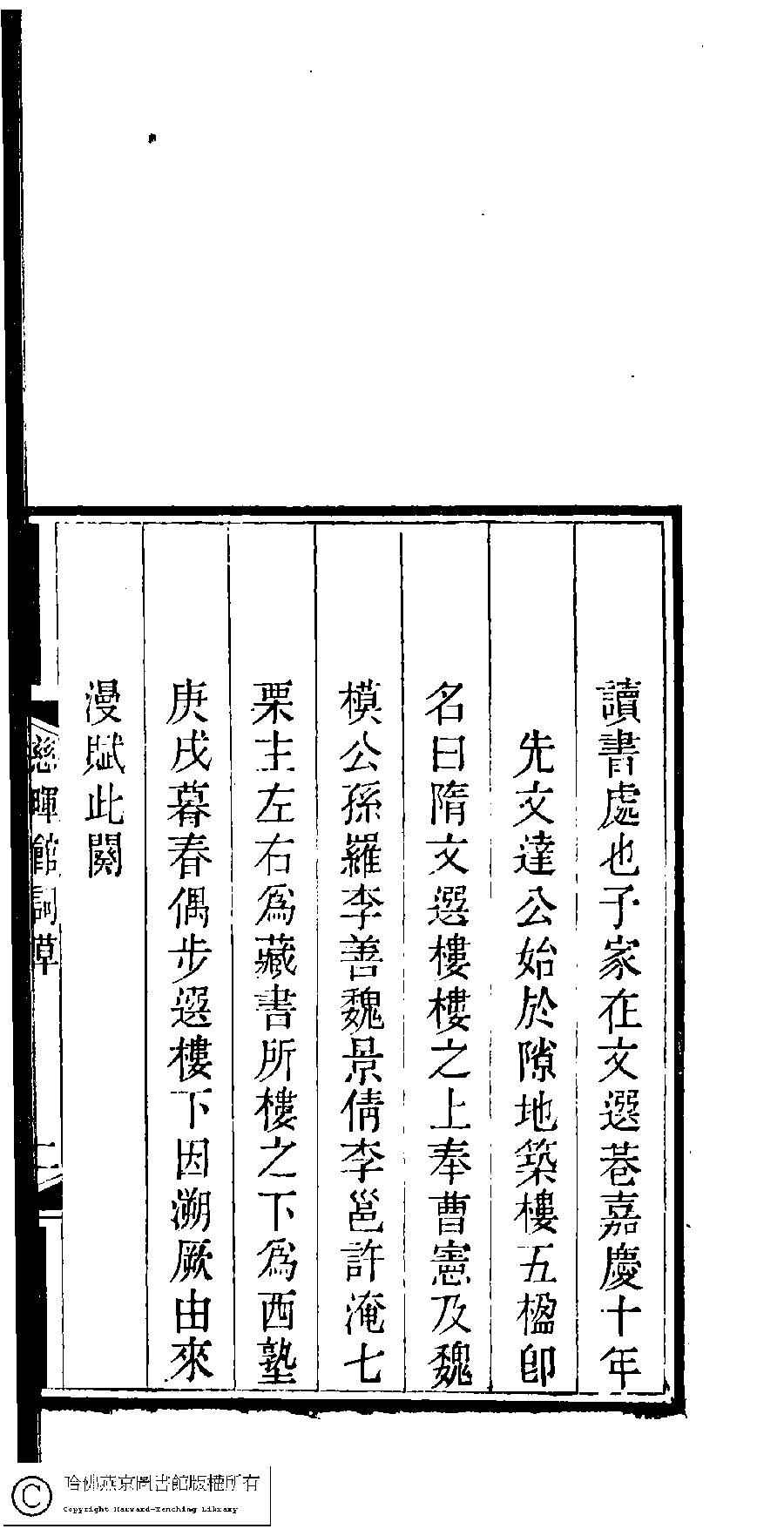 Poem [Han gong chun : Yangzhou Sui wen xuan lou xiang jian yu Song Wang Xiangzhi yu di ji sheng deng shu Sui Cao Xian yi wen xuan xue kai zhi Tang Li Shan deng yi zhu xuan ji zhi fei Zhaoming tai zi du shu chu ye zi jia zai wen xuan xiang jia qing shi nian]