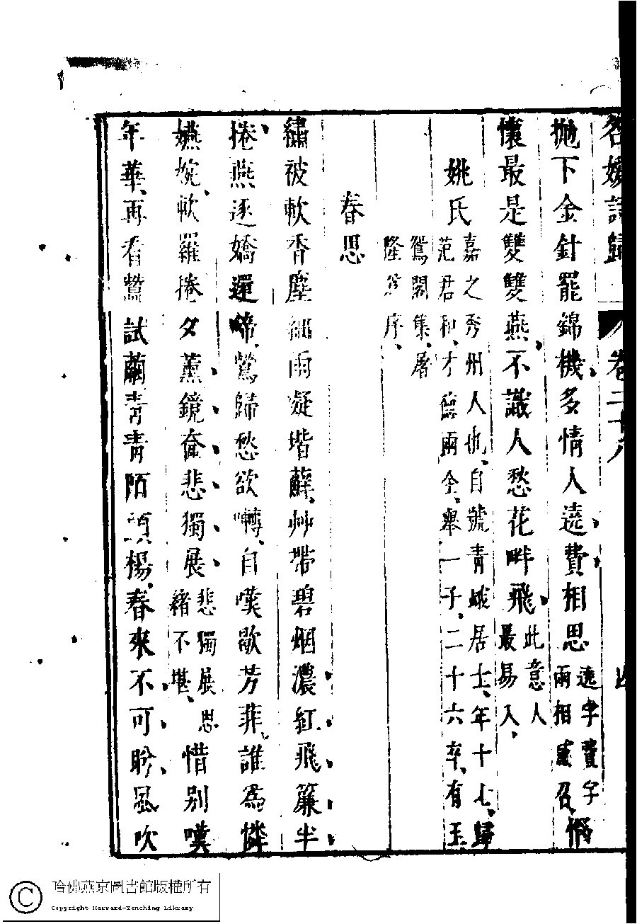 | (PRINT FRIENDLY VERSION) 名媛詩歸﹕三十六卷(鍾惺點次)。明末(1621-1644)刻本 ![]() Page : 28.4b | click for larger image | Back |