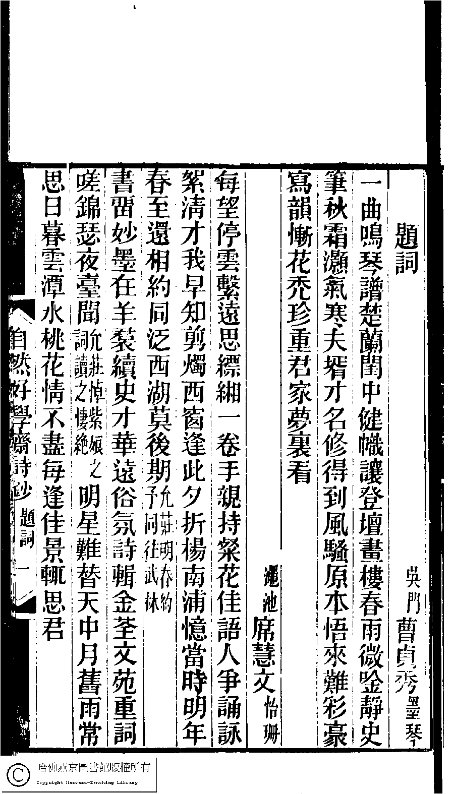 | (PRINT FRIENDLY VERSION) 林下雅音集﹕五種(淸冒俊輯) : 自然好學齋詩鈔: 十卷。淸光緖十年(1884)刻本。 ![]() Page : 題詞.1a | click for larger image | Back |