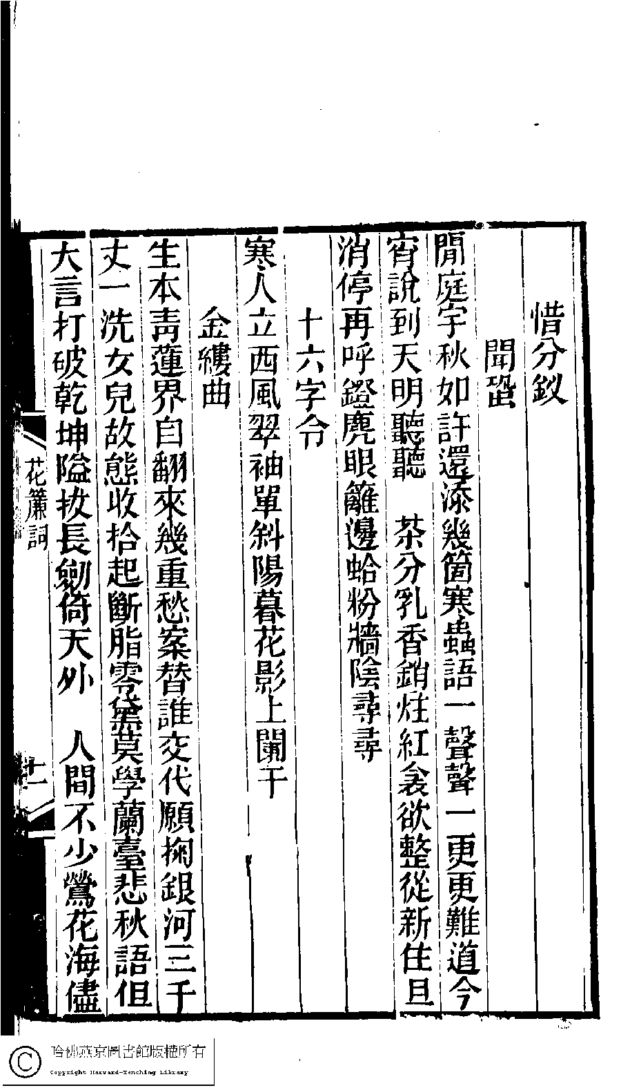 | Appears in: Lin xia ya yin ji: 5 zhong (edited by Mao Jun, Qing dynasty): Hua lian ci: 1 juan |