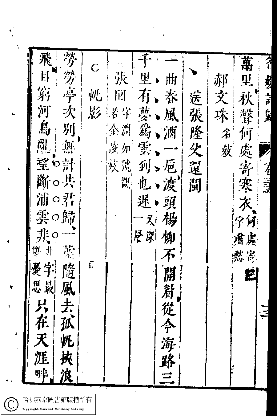 | (PRINT FRIENDLY VERSION) 名媛詩歸﹕三十六卷(鍾惺點次)。明末(1621-1644)刻本 ![]() Page : 35.13b | click for larger image | Back |
