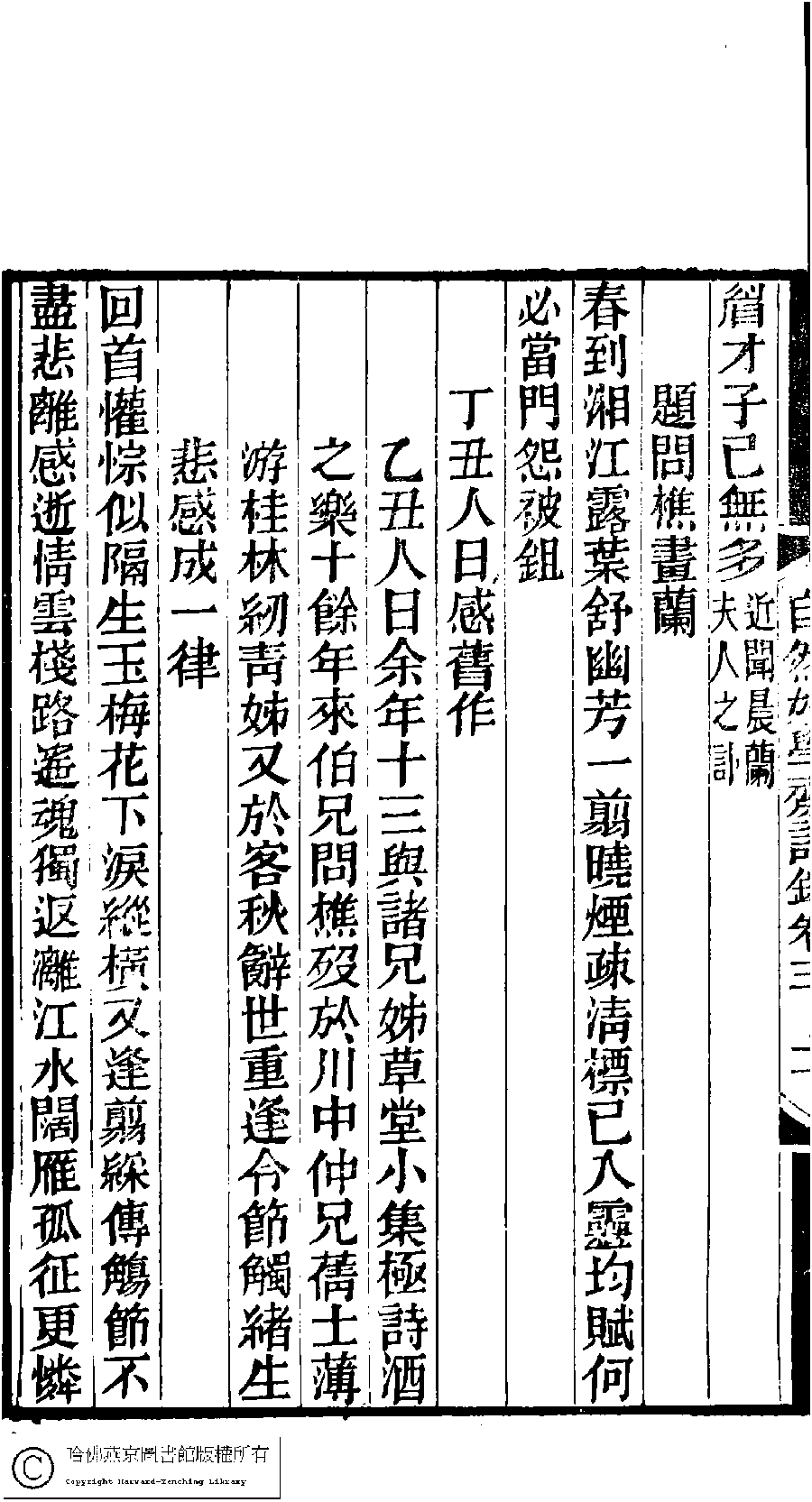 | (PRINT FRIENDLY VERSION) 林下雅音集﹕五種(淸冒俊輯) : 自然好學齋詩鈔: 十卷。淸光緖十年(1884)刻本。 ![]() Page : 3.11b | click for larger image | Back |