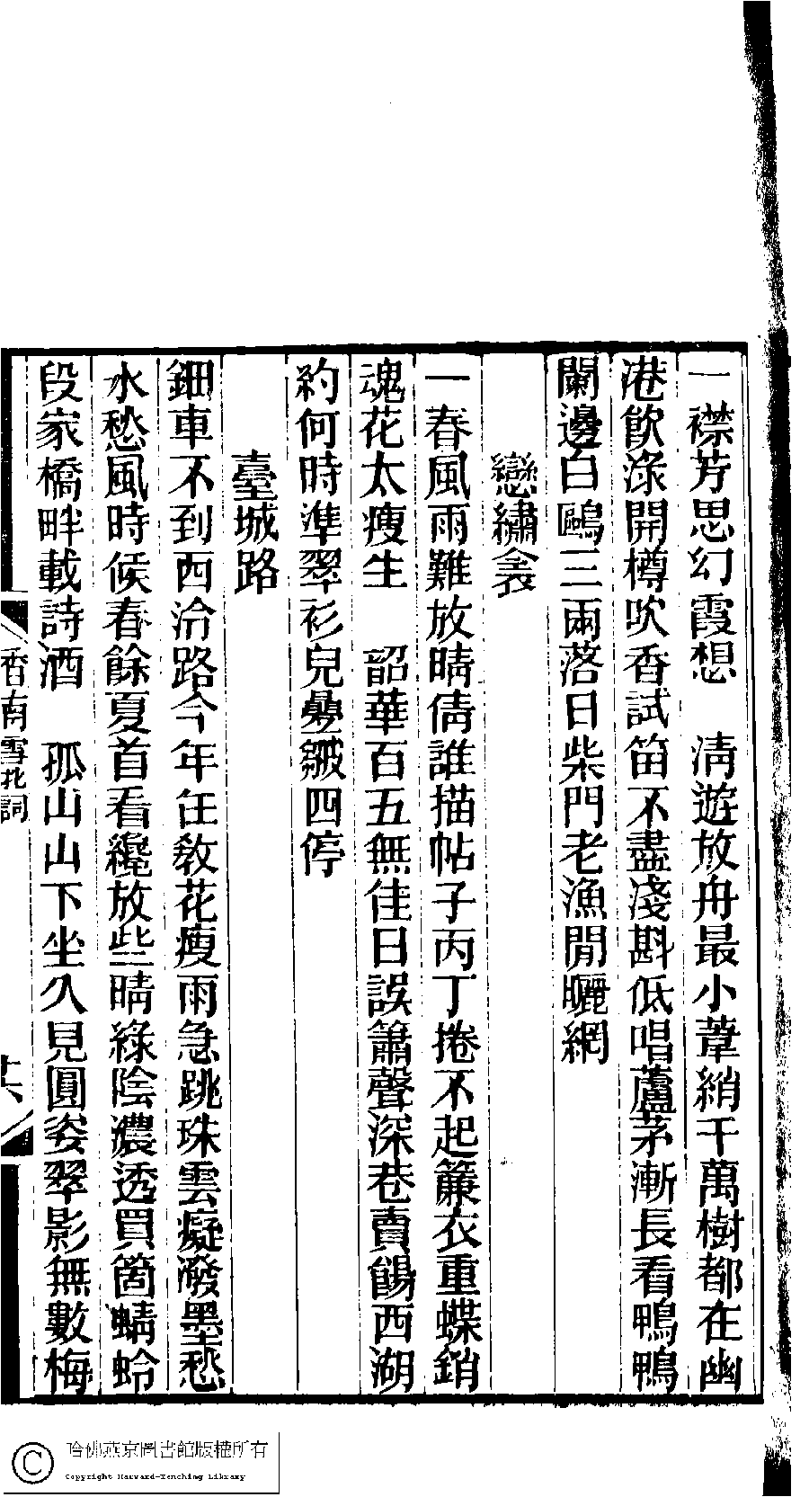| (PRINT FRIENDLY VERSION) 林下雅音集﹕五種(淸冒俊輯) : 香南雪北詞: 一卷。淸光緖十年(1884)刻本。 ![]() Page : 16a | click for larger image | Back |