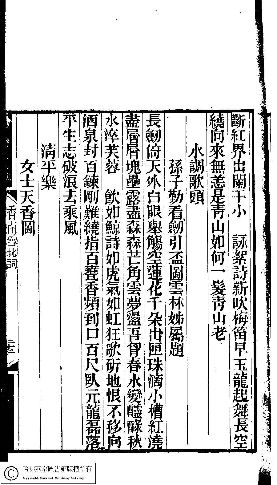 | (PRINT FRIENDLY VERSION) 林下雅音集﹕五種(淸冒俊輯) : 香南雪北詞: 一卷。淸光緖十年(1884)刻本。 ![]() Page : 22a | click for larger image | Back |
