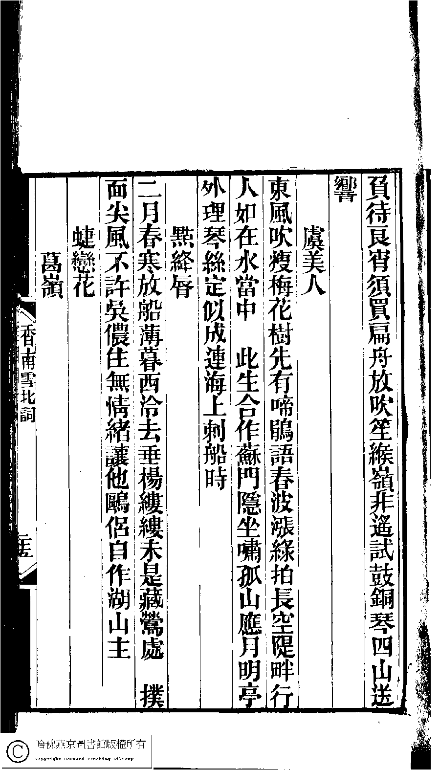 | (PRINT FRIENDLY VERSION) 林下雅音集﹕五種(淸冒俊輯) : 香南雪北詞: 一卷。淸光緖十年(1884)刻本。 ![]() Page : 25a | click for larger image | Back |