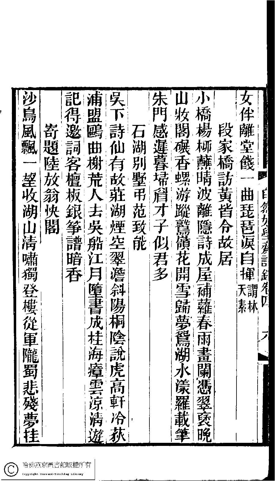 | (PRINT FRIENDLY VERSION) 林下雅音集﹕五種(淸冒俊輯) : 自然好學齋詩鈔: 十卷。淸光緖十年(1884)刻本。 ![]() Page : 4.6b | click for larger image | Back |