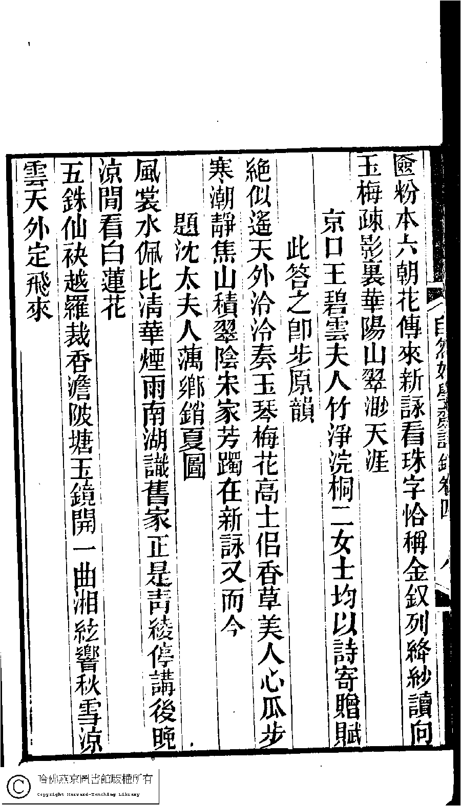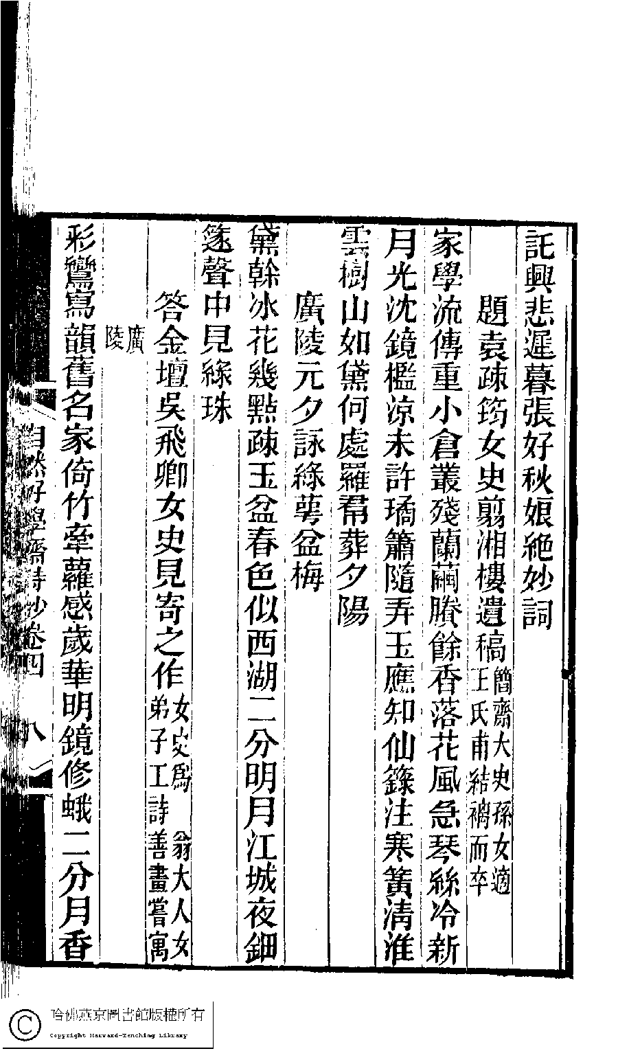 | (PRINT FRIENDLY VERSION) 林下雅音集﹕五種(淸冒俊輯) : 自然好學齋詩鈔: 十卷。淸光緖十年(1884)刻本。 ![]() Page : 4.8b | click for larger image | 林下雅音集﹕五種(淸冒俊輯) : 自然好學齋詩鈔: 十卷。淸光緖十年(1884)刻本。![]() Page : 4.8a | click for larger image | Back |