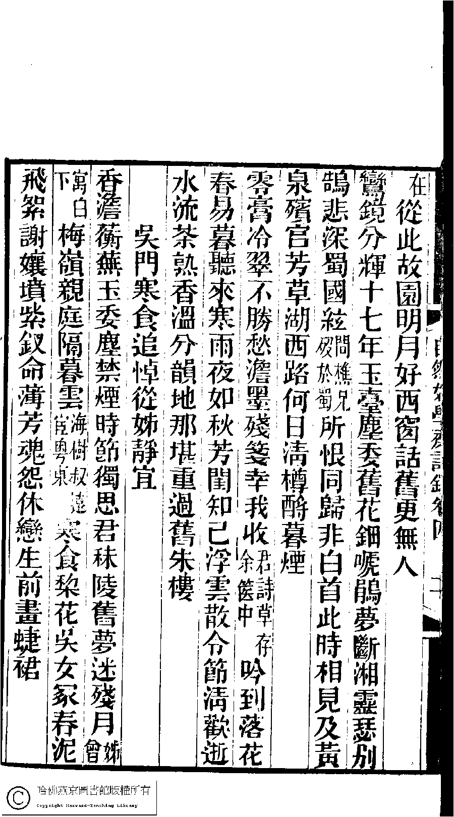 | (PRINT FRIENDLY VERSION) 林下雅音集﹕五種(淸冒俊輯) : 自然好學齋詩鈔: 十卷。淸光緖十年(1884)刻本。 ![]() Page : 4.11b | click for larger image | Back |