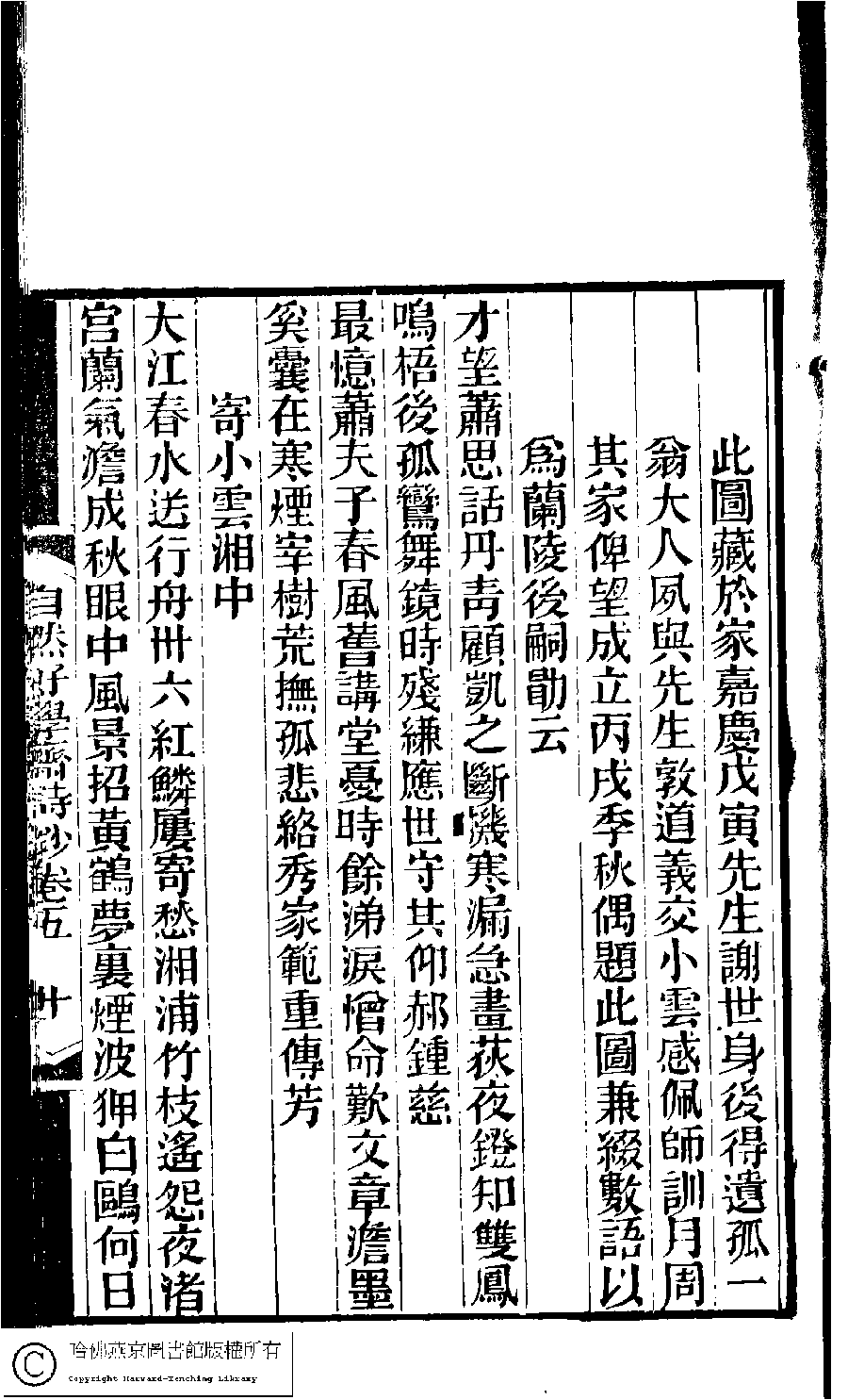 | (PRINT FRIENDLY VERSION) 林下雅音集﹕五種(淸冒俊輯) : 自然好學齋詩鈔: 十卷。淸光緖十年(1884)刻本。 ![]() Page : 5.10a | click for larger image | 林下雅音集﹕五種(淸冒俊輯) : 自然好學齋詩鈔: 十卷。淸光緖十年(1884)刻本。![]() Page : 5.9b | click for larger image | Back |