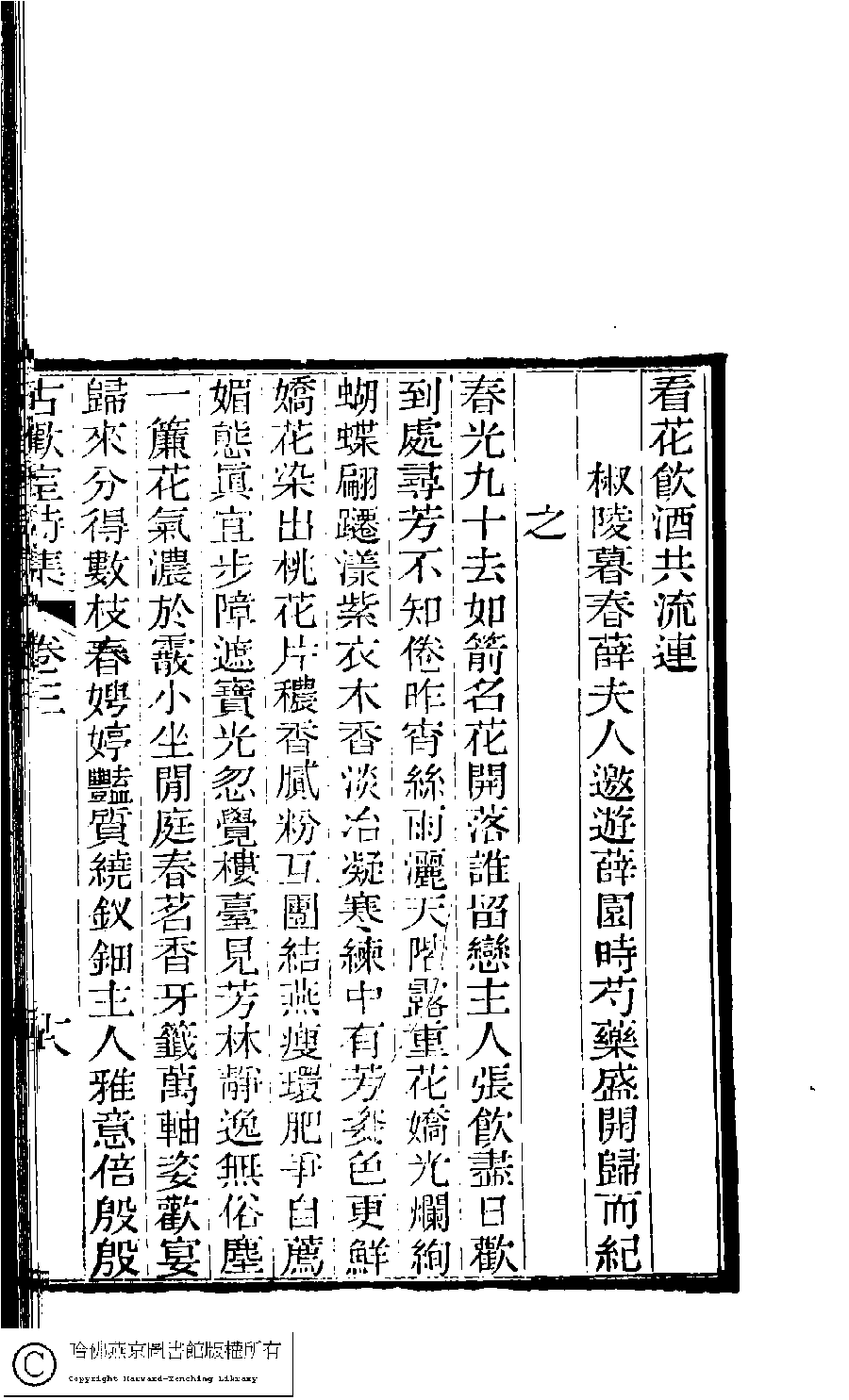 | (PRINT FRIENDLY VERSION) 古歡室詩集:三卷﹐詞集﹕一卷(清曾懿撰)。清光緖三十三年(1907)刻本。 ![]() Page : 3.18a | click for larger image | 古歡室詩集:三卷﹐詞集﹕一卷(清曾懿撰)。清光緖三十三年(1907)刻本。![]() Page : 3.17b | click for larger image | Back |
