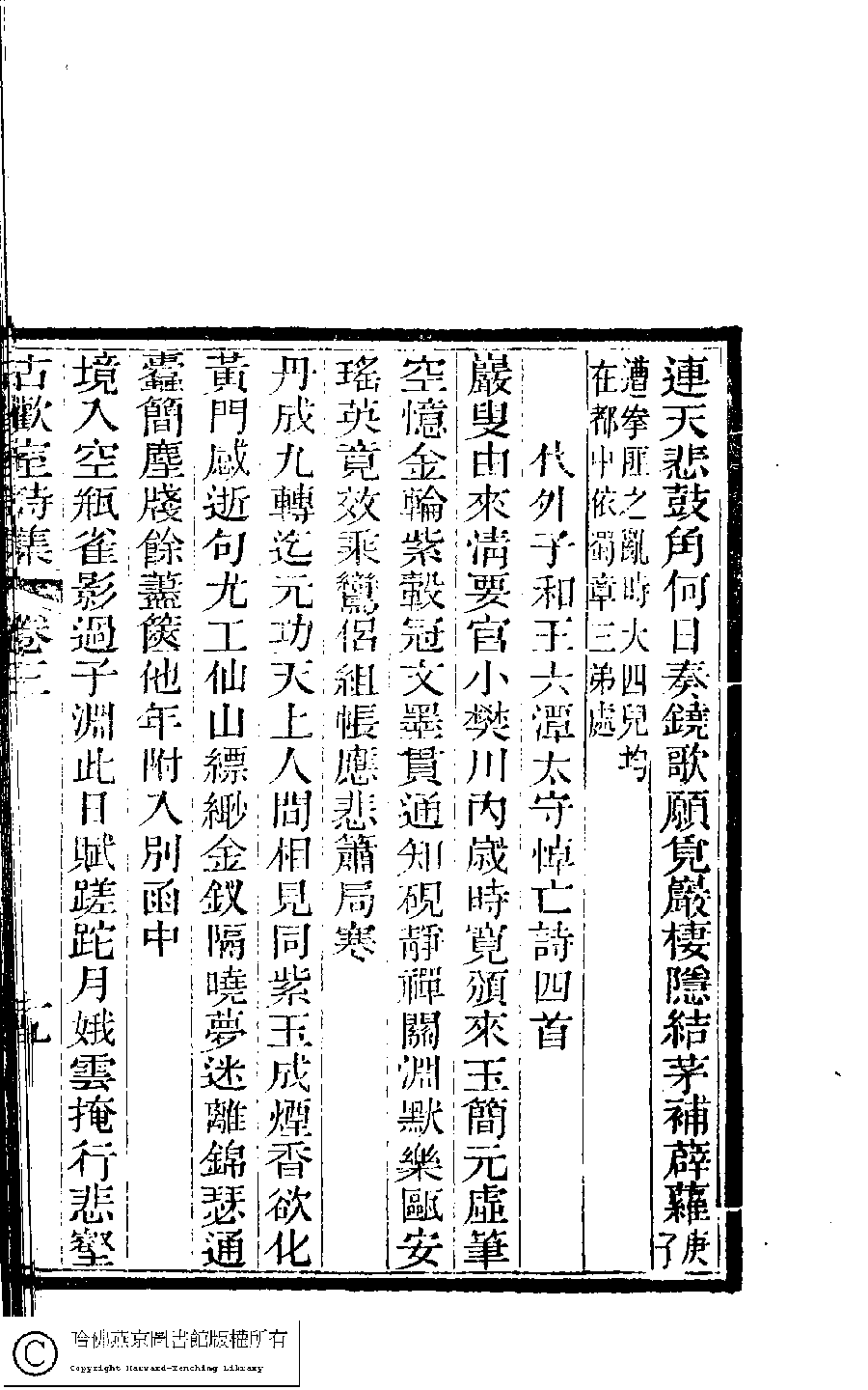 | (PRINT FRIENDLY VERSION) 古歡室詩集:三卷﹐詞集﹕一卷(清曾懿撰)。清光緖三十三年(1907)刻本。 ![]() Page : 3.19b | click for larger image | 古歡室詩集:三卷﹐詞集﹕一卷(清曾懿撰)。清光緖三十三年(1907)刻本。![]() Page : 3.19a | click for larger image | Back |