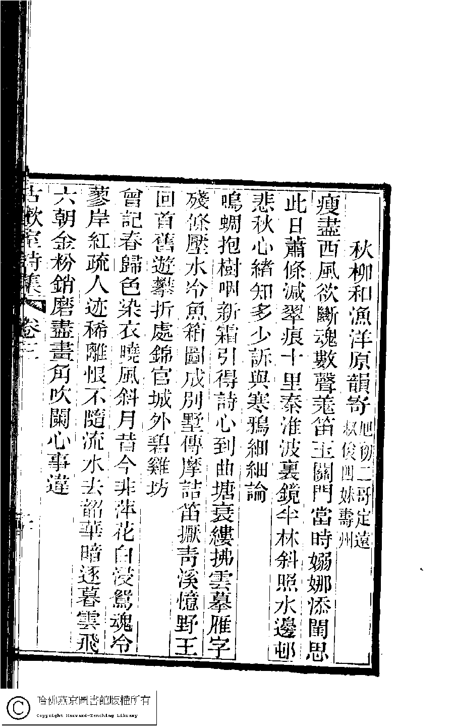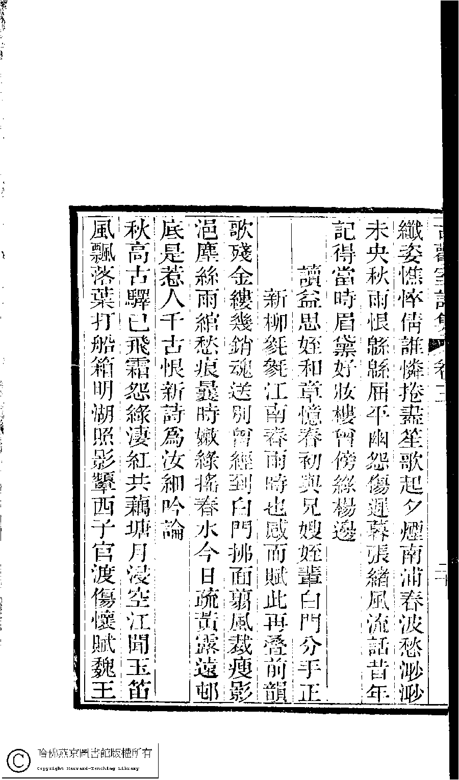 | (PRINT FRIENDLY VERSION) 古歡室詩集:三卷﹐詞集﹕一卷(清曾懿撰)。清光緖三十三年(1907)刻本。 ![]() Page : 3.20b | click for larger image | 古歡室詩集:三卷﹐詞集﹕一卷(清曾懿撰)。清光緖三十三年(1907)刻本。![]() Page : 3.20a | click for larger image | Back |