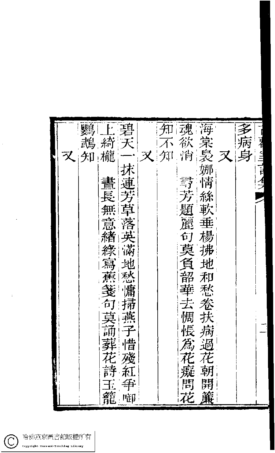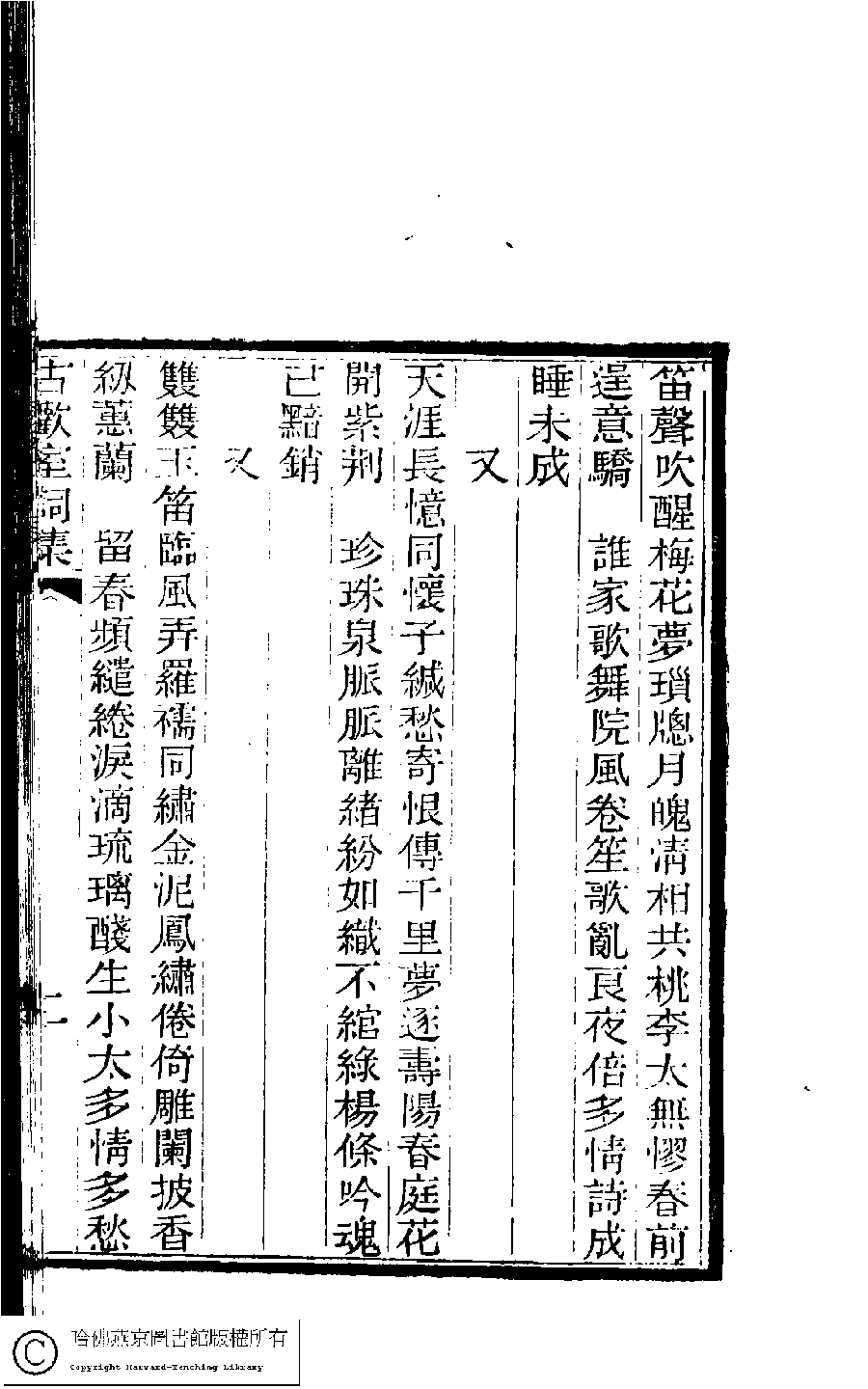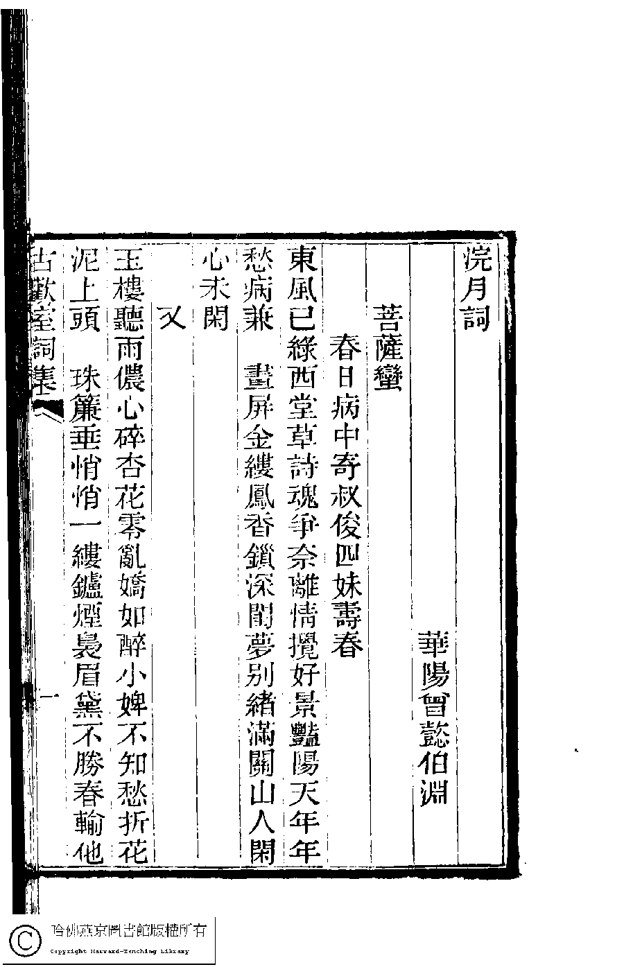 | (PRINT FRIENDLY VERSION) 古歡室詩集:三卷﹐詞集﹕一卷(清曾懿撰) ![]() Page : 詞.2b | click for larger image | 古歡室詩集:三卷﹐詞集﹕一卷(清曾懿撰)![]() Page : 詞.2a | click for larger image | 古歡室詩集:三卷﹐詞集﹕一卷(清曾懿撰)![]() Page : 詞.1b | click for larger image | 古歡室詩集:三卷﹐詞集﹕一卷(清曾懿撰)![]() Page : 詞.1a | click for larger image |