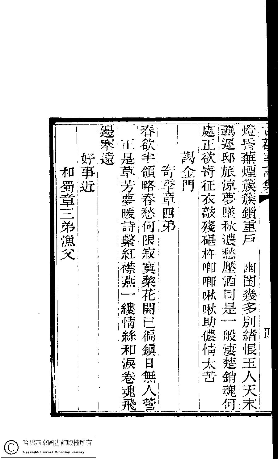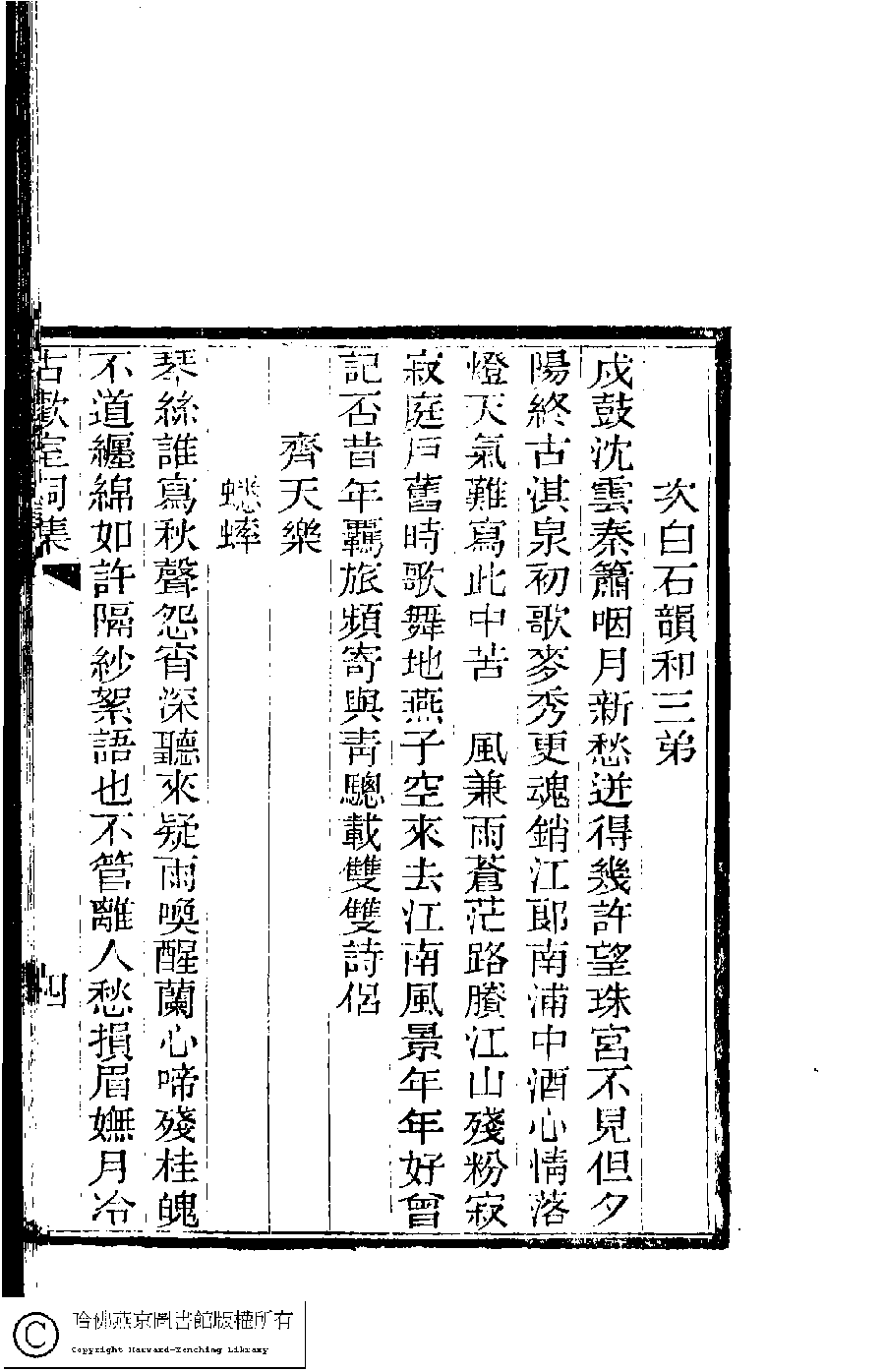 | (PRINT FRIENDLY VERSION) 古歡室詩集:三卷﹐詞集﹕一卷(清曾懿撰)。清光緖三十三年(1907)刻本。 ![]() Page : 詞.4b | click for larger image | 古歡室詩集:三卷﹐詞集﹕一卷(清曾懿撰)。清光緖三十三年(1907)刻本。![]() Page : 詞.4a | click for larger image | Back |