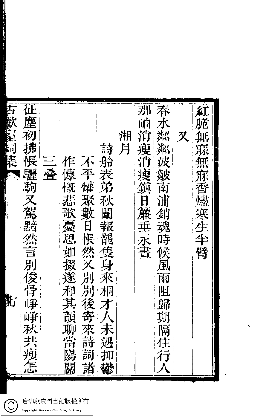 | (PRINT FRIENDLY VERSION) 古歡室詩集:三卷﹐詞集﹕一卷(清曾懿撰)。清光緖三十三年(1907)刻本。 ![]() Page : 詞.7b | click for larger image | 古歡室詩集:三卷﹐詞集﹕一卷(清曾懿撰)。清光緖三十三年(1907)刻本。![]() Page : 詞.7a | click for larger image | Back |