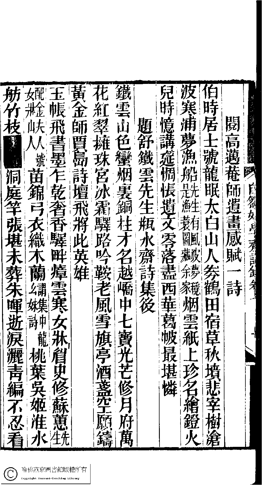 | (PRINT FRIENDLY VERSION) 林下雅音集﹕五種(淸冒俊輯) : 自然好學齋詩鈔: 十卷。淸光緖十年(1884)刻本。 ![]() Page : 7.2a | click for larger image | 林下雅音集﹕五種(淸冒俊輯) : 自然好學齋詩鈔: 十卷。淸光緖十年(1884)刻本。![]() Page : 7.1b | click for larger image | Back |