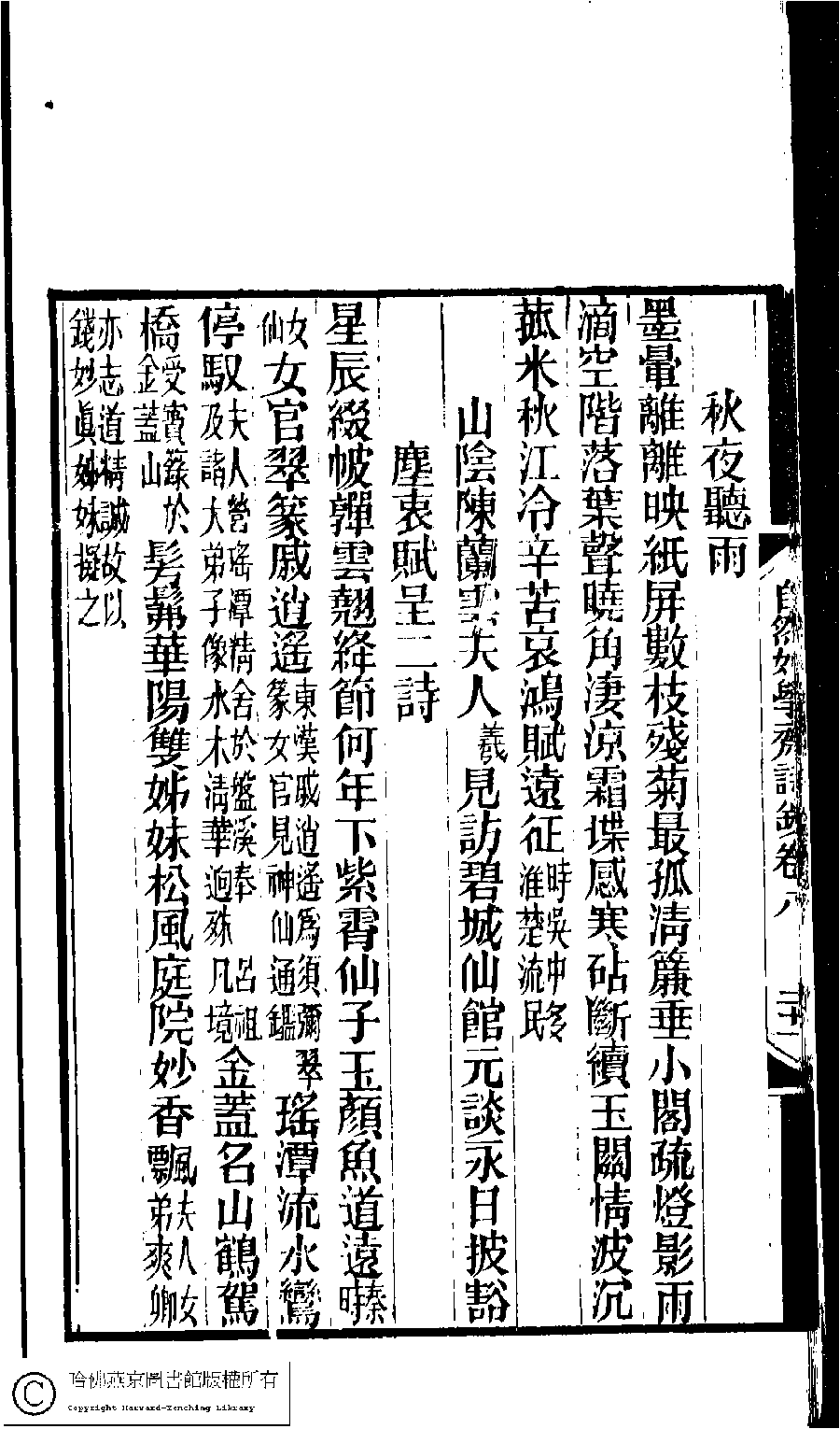 | (PRINT FRIENDLY VERSION) 林下雅音集﹕五種(淸冒俊輯) : 自然好學齋詩鈔: 十卷。淸光緖十年(1884)刻本。 ![]() Page : 8.21b | click for larger image | Back |