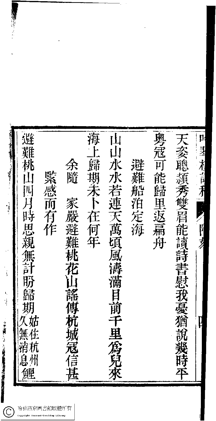 | (PRINT FRIENDLY VERSION) 吟翠樓詩稿﹕一卷﹐附刻﹕一卷(清孫佩蘭撰)。光緖十四年(1888)刻本。 ![]() Page : 5a | click for larger image | 吟翠樓詩稿﹕一卷﹐附刻﹕一卷(清孫佩蘭撰)。光緖十四年(1888)刻本。![]() Page : 4b | click for larger image | Back |
