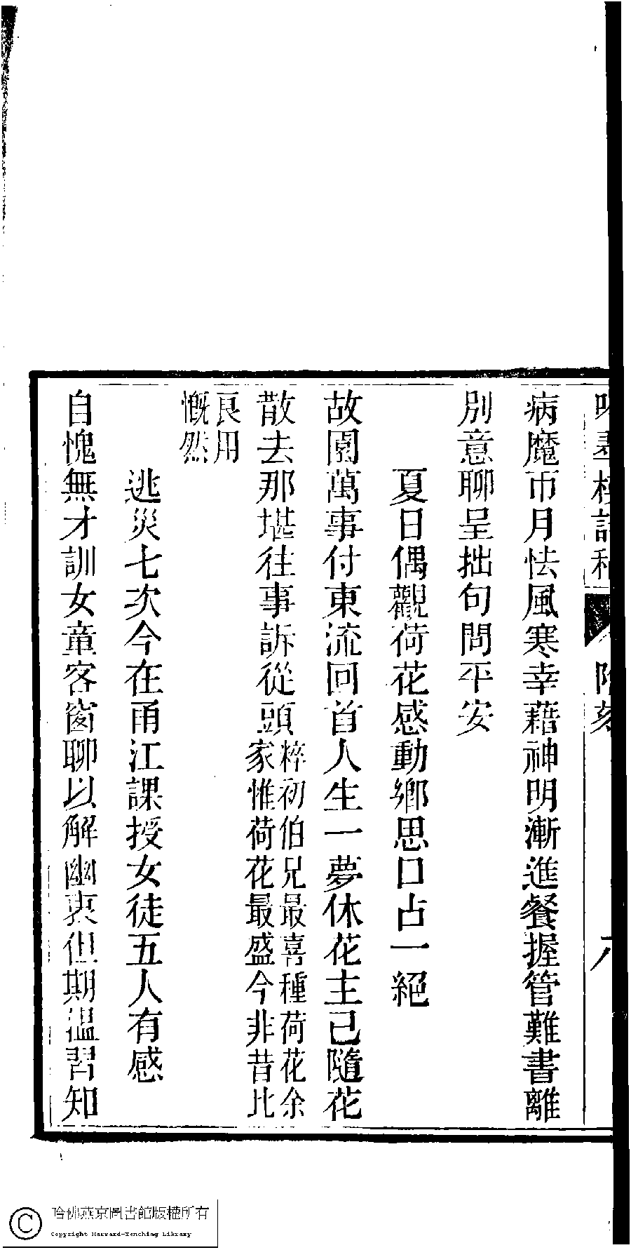 | (PRINT FRIENDLY VERSION) 吟翠樓詩稿﹕一卷﹐附刻﹕一卷(清孫佩蘭撰)。光緖十四年(1888)刻本。 ![]() Page : 9a | click for larger image | 吟翠樓詩稿﹕一卷﹐附刻﹕一卷(清孫佩蘭撰)。光緖十四年(1888)刻本。![]() Page : 8b | click for larger image | Back |