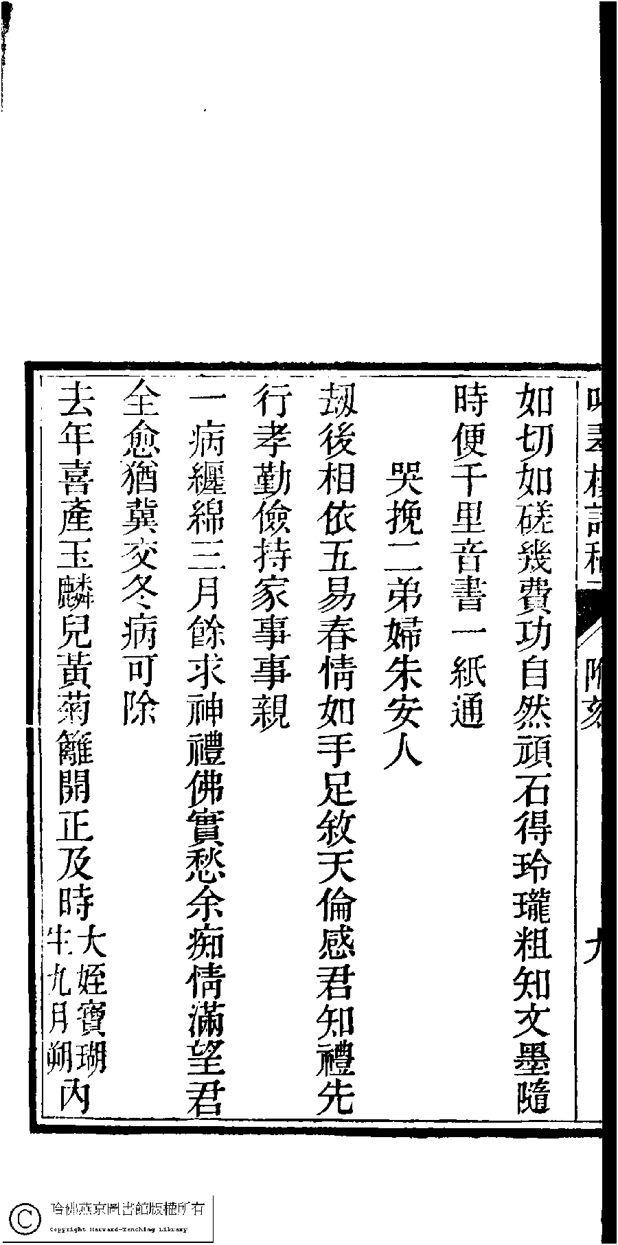 | (PRINT FRIENDLY VERSION) 吟翠樓詩稿﹕一卷﹐附刻﹕一卷(清孫佩蘭撰)。光緖十四年(1888)刻本。 ![]() Page : 9b | click for larger image | 吟翠樓詩稿﹕一卷﹐附刻﹕一卷(清孫佩蘭撰)。光緖十四年(1888)刻本。![]() Page : 9a | click for larger image | Back |