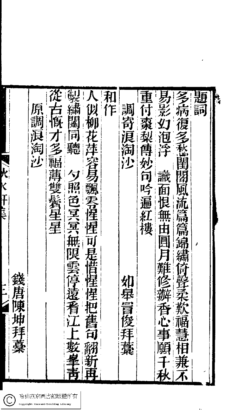 | (PRINT FRIENDLY VERSION) 林下雅音集﹕五種(淸冒俊輯) : 秋水軒詩詞集: 一卷。淸光緖十年(1884)刻本。 ![]() Page : 3b | click for larger image | 林下雅音集﹕五種(淸冒俊輯) : 秋水軒詩詞集: 一卷。淸光緖十年(1884)刻本。![]() Page : 3a | click for larger image | Back |