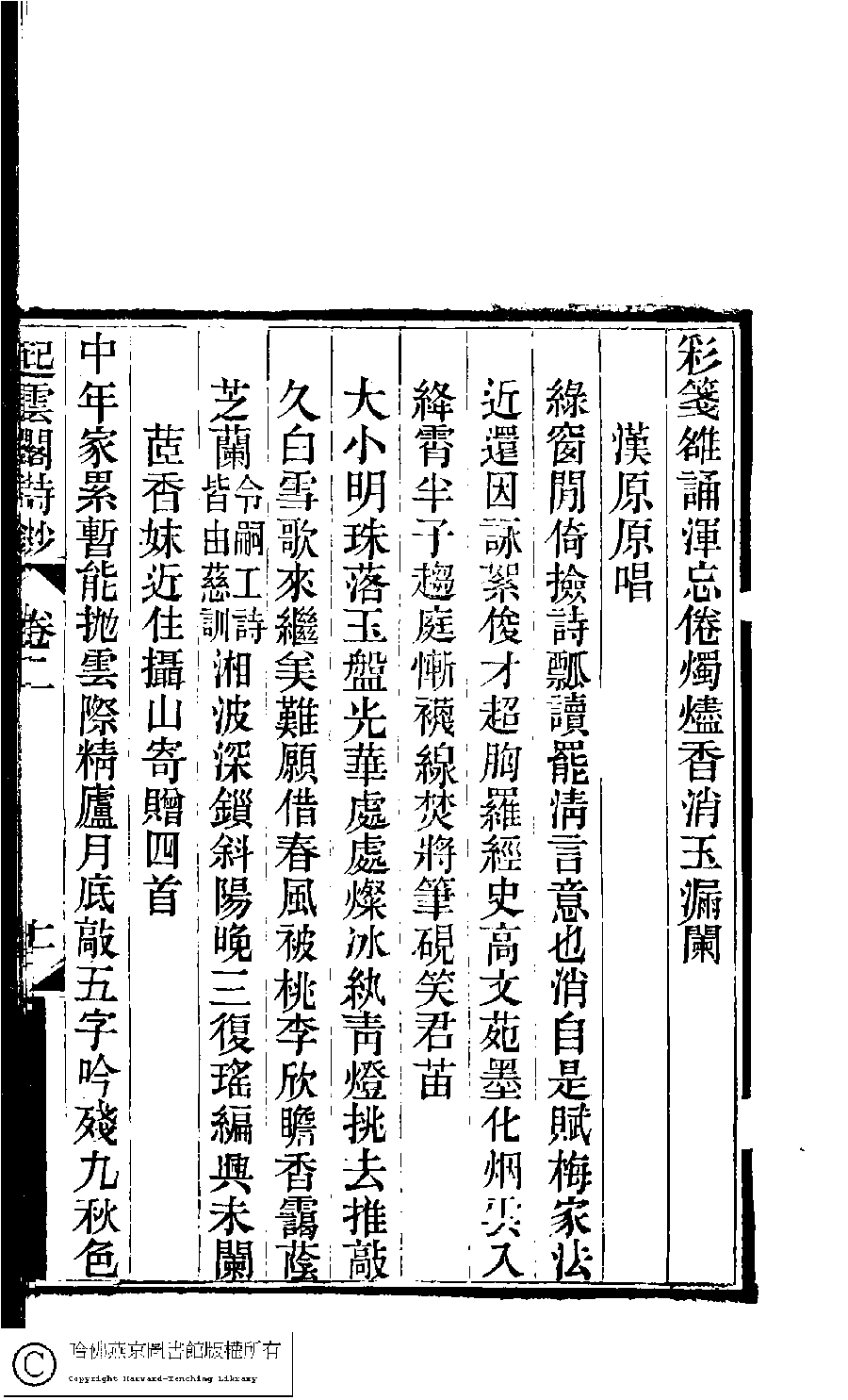 | (PRINT FRIENDLY VERSION) 京江鮑氏三女史詩鈔合刻(清戴燮元輯) : 起雲閣詩鈔。清光緖八年(1882) 刻本。 ![]() Page : 2.11b | click for larger image | 京江鮑氏三女史詩鈔合刻(清戴燮元輯) : 起雲閣詩鈔。清光緖八年(1882) 刻本。![]() Page : 2.11a | click for larger image | Back |