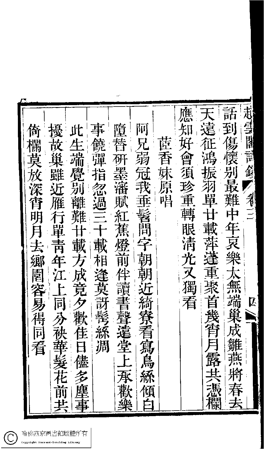 | (PRINT FRIENDLY VERSION) 京江鮑氏三女史詩鈔合刻(清戴燮元輯) : 起雲閣詩鈔。清光緖八年(1882) 刻本。 ![]() Page : 3.4b | click for larger image | Back |