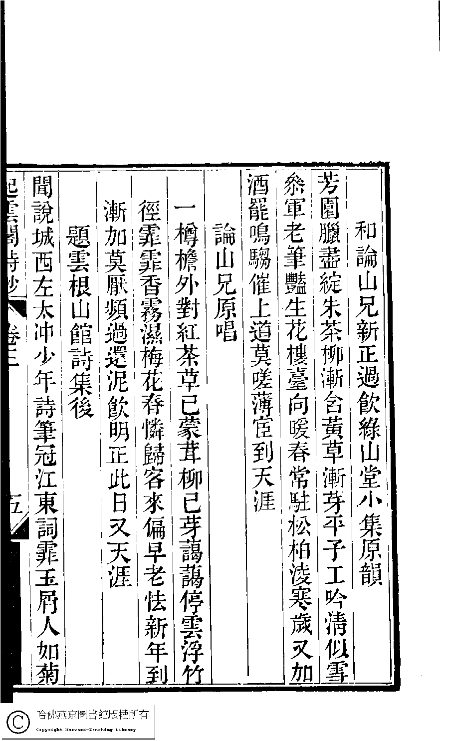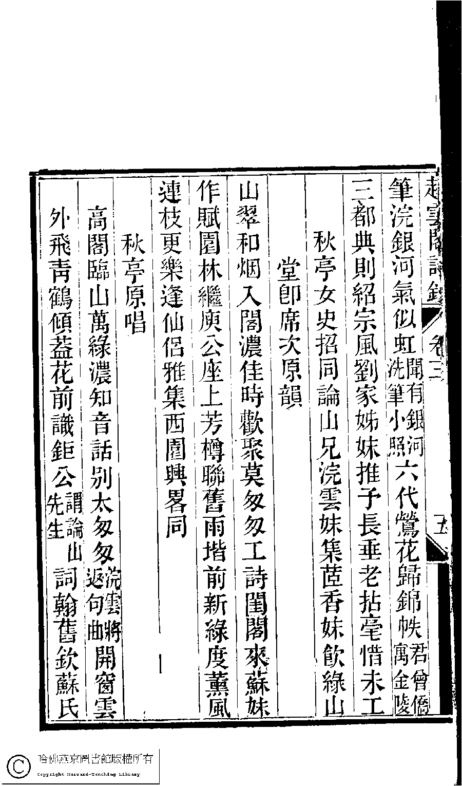 | (PRINT FRIENDLY VERSION) 京江鮑氏三女史詩鈔合刻(清戴燮元輯) : 起雲閣詩鈔。清光緖八年(1882) 刻本。 ![]() Page : 3.5b | click for larger image | 京江鮑氏三女史詩鈔合刻(清戴燮元輯) : 起雲閣詩鈔。清光緖八年(1882) 刻本。![]() Page : 3.5a | click for larger image | Back |