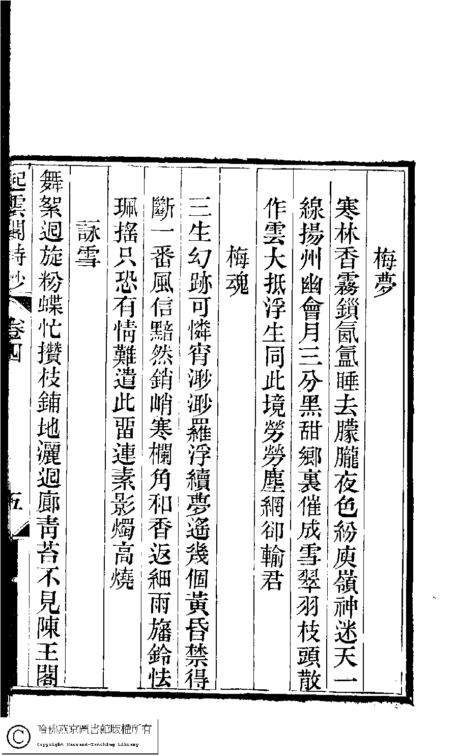 | (PRINT FRIENDLY VERSION) 京江鮑氏三女史詩鈔合刻(清戴燮元輯) : 起雲閣詩鈔。清光緖八年(1882) 刻本。 ![]() Page : 4.5a | click for larger image | Back |