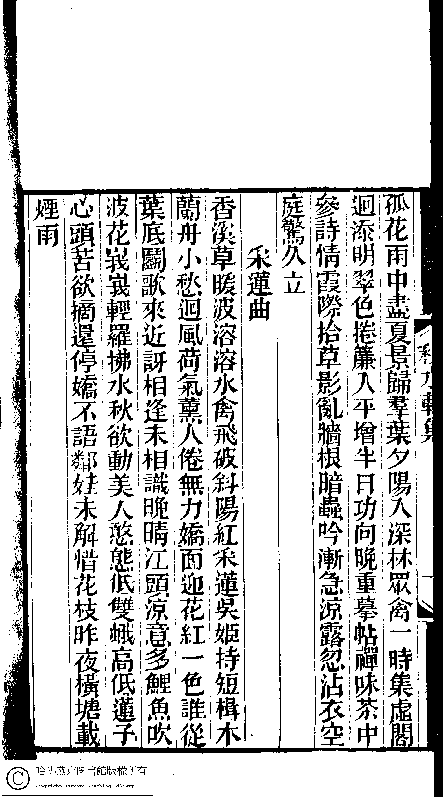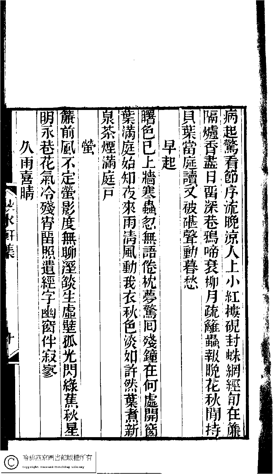 | (PRINT FRIENDLY VERSION) 林下雅音集﹕五種(淸冒俊輯) : 秋水軒詩詞集: 一卷。淸光緖十年(1884)刻本。 ![]() Page : 10b | click for larger image | 林下雅音集﹕五種(淸冒俊輯) : 秋水軒詩詞集: 一卷。淸光緖十年(1884)刻本。![]() Page : 10a | click for larger image | Back |