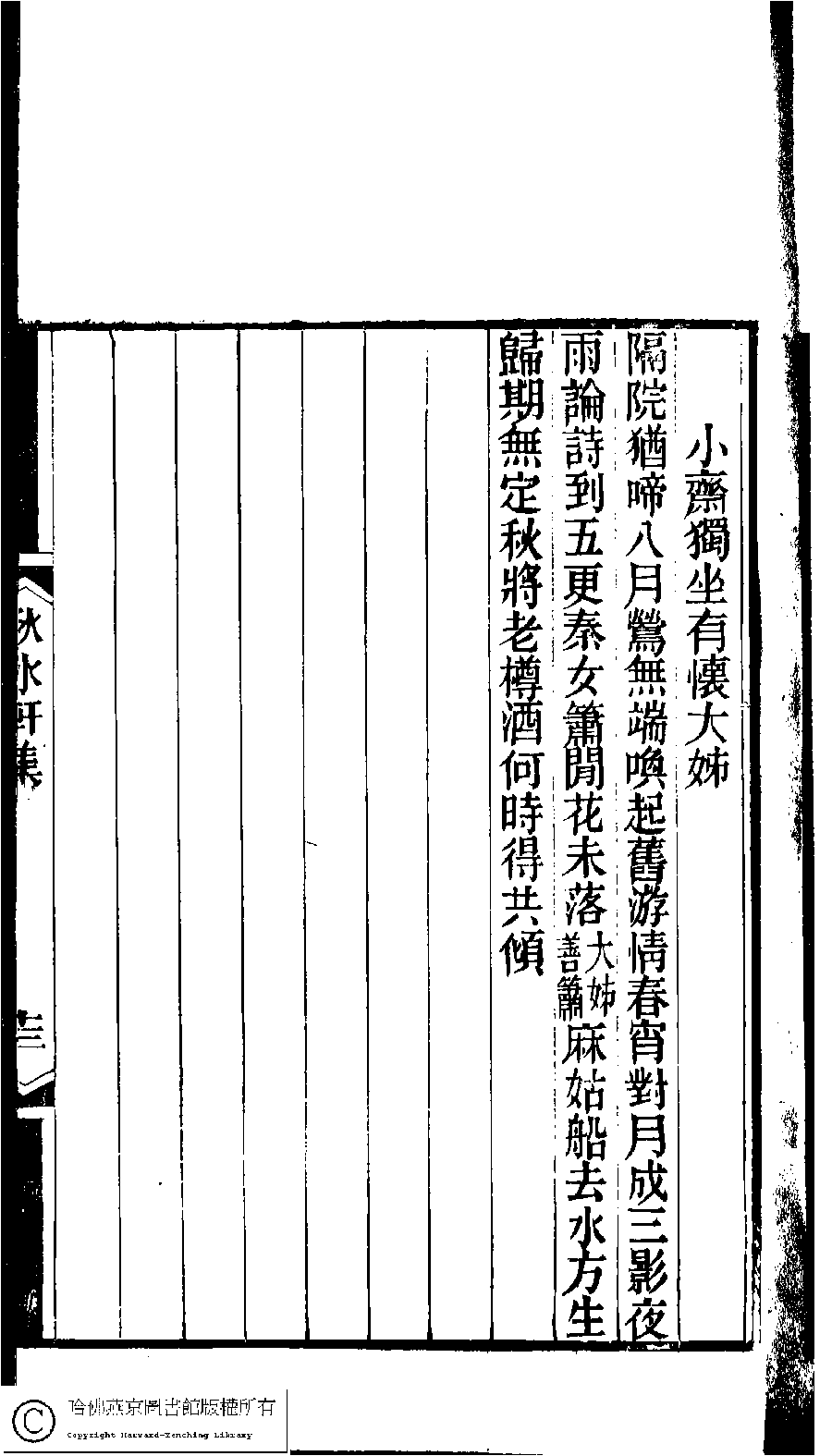 | (PRINT FRIENDLY VERSION) 林下雅音集﹕五種(淸冒俊輯) : 秋水軒詩詞集: 一卷。淸光緖十年(1884)刻本。 ![]() Page : 13b | click for larger image | 林下雅音集﹕五種(淸冒俊輯) : 秋水軒詩詞集: 一卷。淸光緖十年(1884)刻本。![]() Page : 13a | click for larger image | Back |