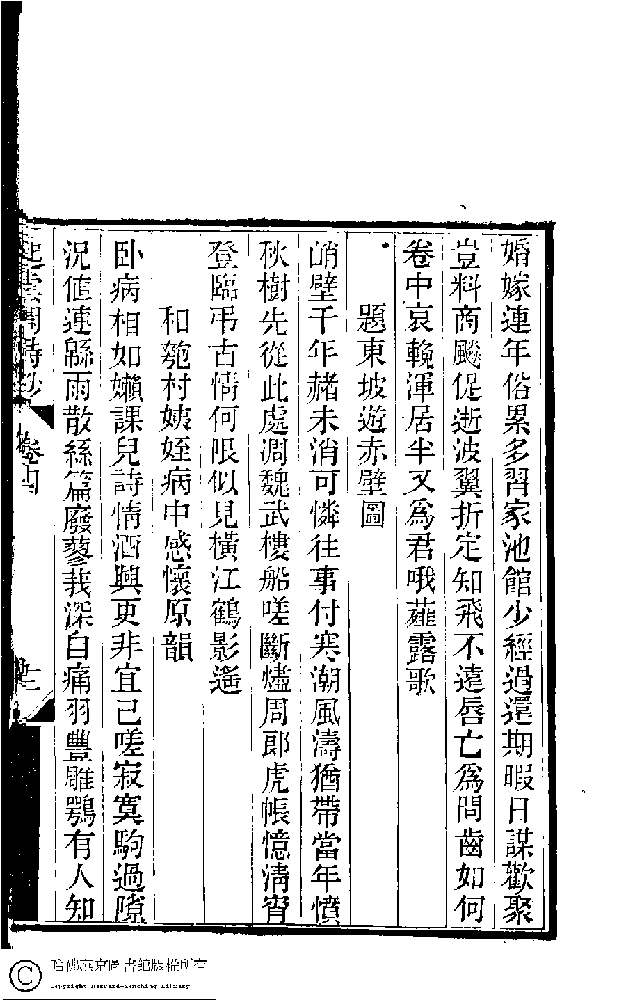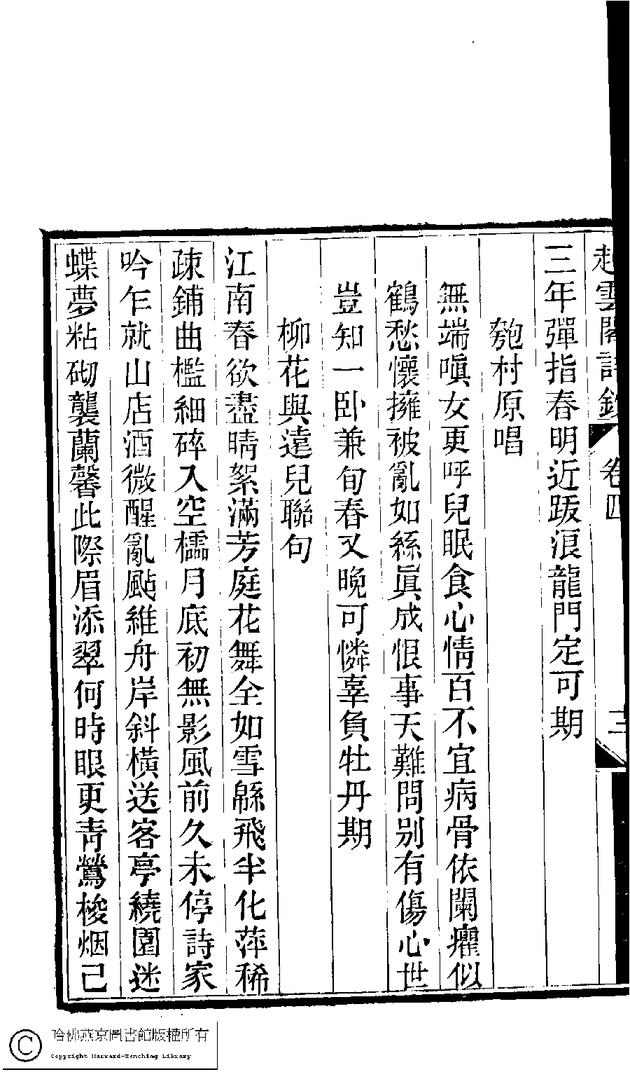 | (PRINT FRIENDLY VERSION) 京江鮑氏三女史詩鈔合刻(清戴燮元輯) : 起雲閣詩鈔。清光緖八年(1882) 刻本。 ![]() Page : 4.12b | click for larger image | 京江鮑氏三女史詩鈔合刻(清戴燮元輯) : 起雲閣詩鈔。清光緖八年(1882) 刻本。![]() Page : 4.12a | click for larger image | Back |