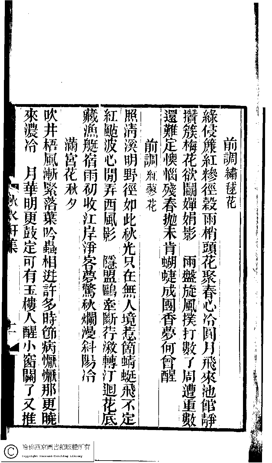 | (PRINT FRIENDLY VERSION) 林下雅音集﹕五種(淸冒俊輯) : 秋水軒詩詞集: 一卷。淸光緖十年(1884)刻本。 ![]() Page : 詞.11a | click for larger image | Back |