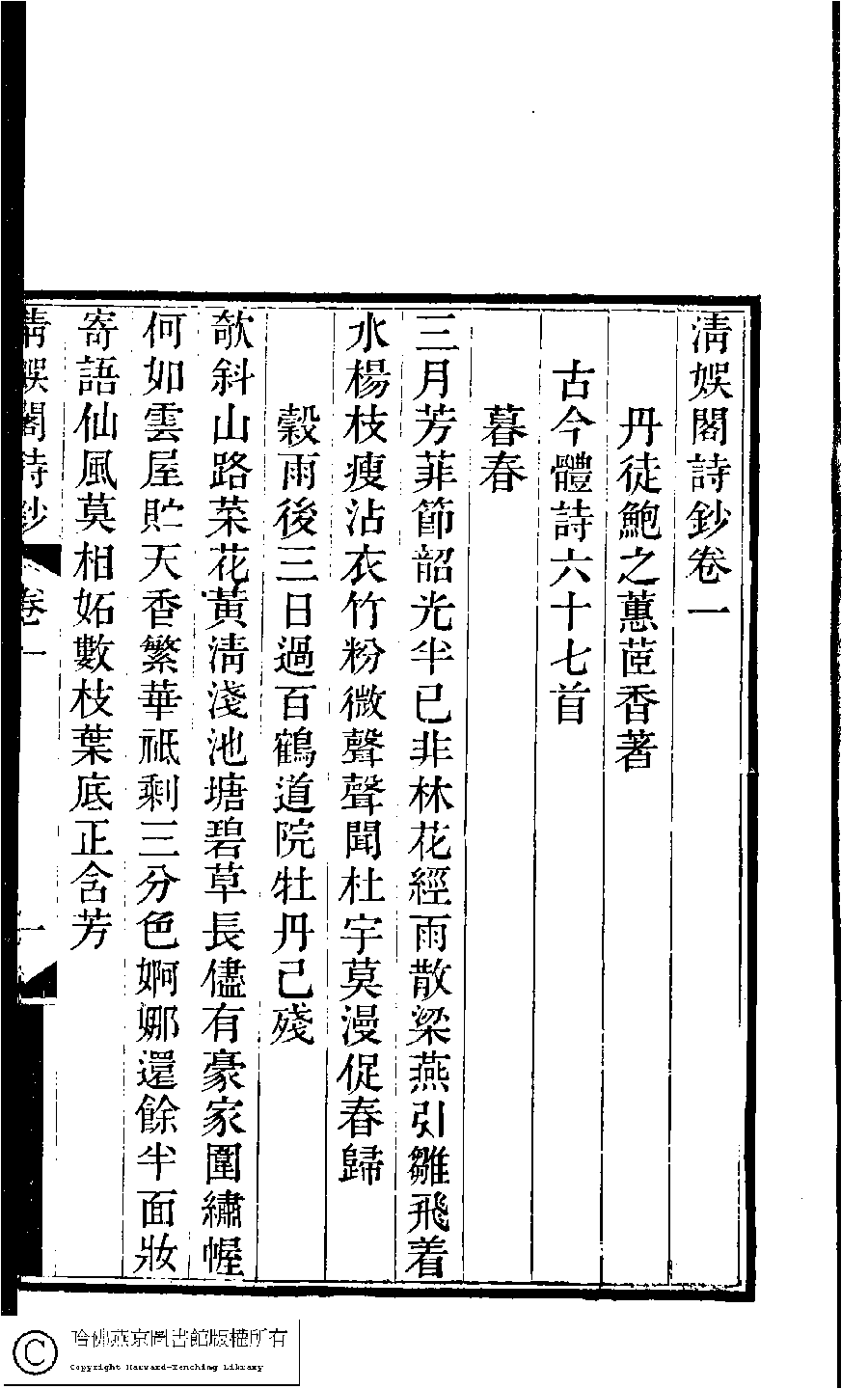 | (PRINT FRIENDLY VERSION) 京江鮑氏三女史詩鈔合刻(清戴燮元輯) : 清娛閣詩鈔。清光緖八年(1882) 刻本。 ![]() Page : 1.1a | click for larger image | Back |