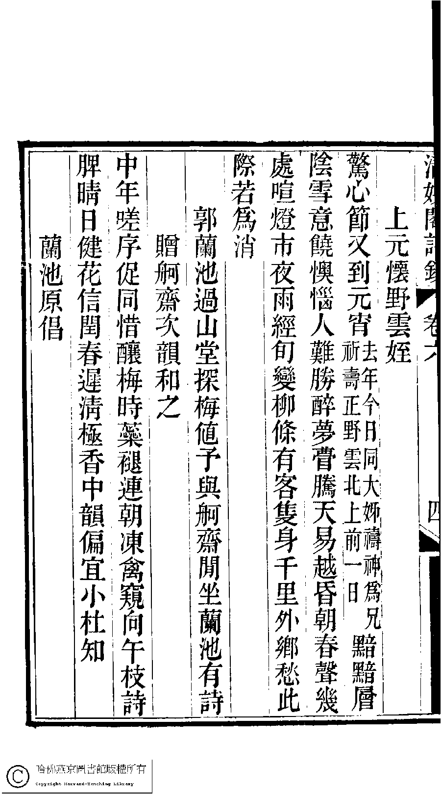 | (PRINT FRIENDLY VERSION) 京江鮑氏三女史詩鈔合刻(清戴燮元輯) : 清娛閣詩鈔。清光緖八年(1882) 刻本。 ![]() Page : 6.4b | click for larger image | Back |